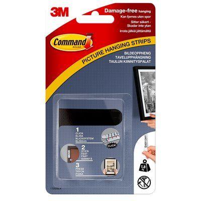 3 M Command Picture Hanging Strips Small Black - 4 pairs. A packet with 4 pairs of thin, black picture hanging strips which hold a frame of max 1.8 kg. Suits picture frames up to 40x60 cm. Dimensions: Approx. 1.3x7.3 cm (WxL).