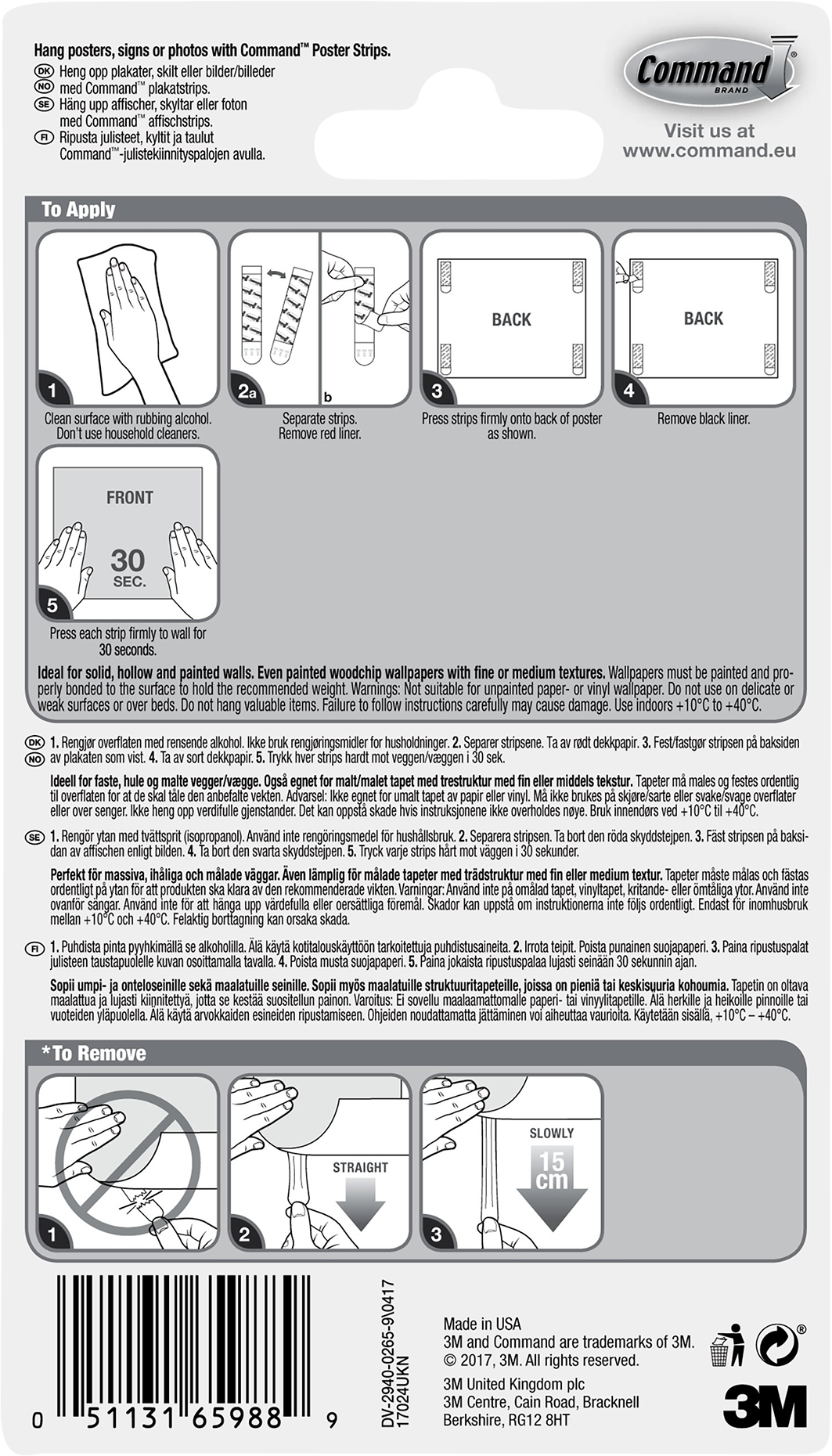 Command Poster Strips are a quick and smooth solution for secure hanging of posters, calendars, and other light items. The hanging strips easily attach to the wall and can be used on most smooth surfaces, such as painted walls, painted wallpaper, tiles, metal, and wood. They should not be used on unpainted wallpaper, vinyl wallpaper, or delicate surfaces.