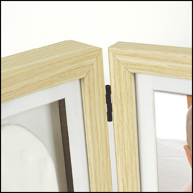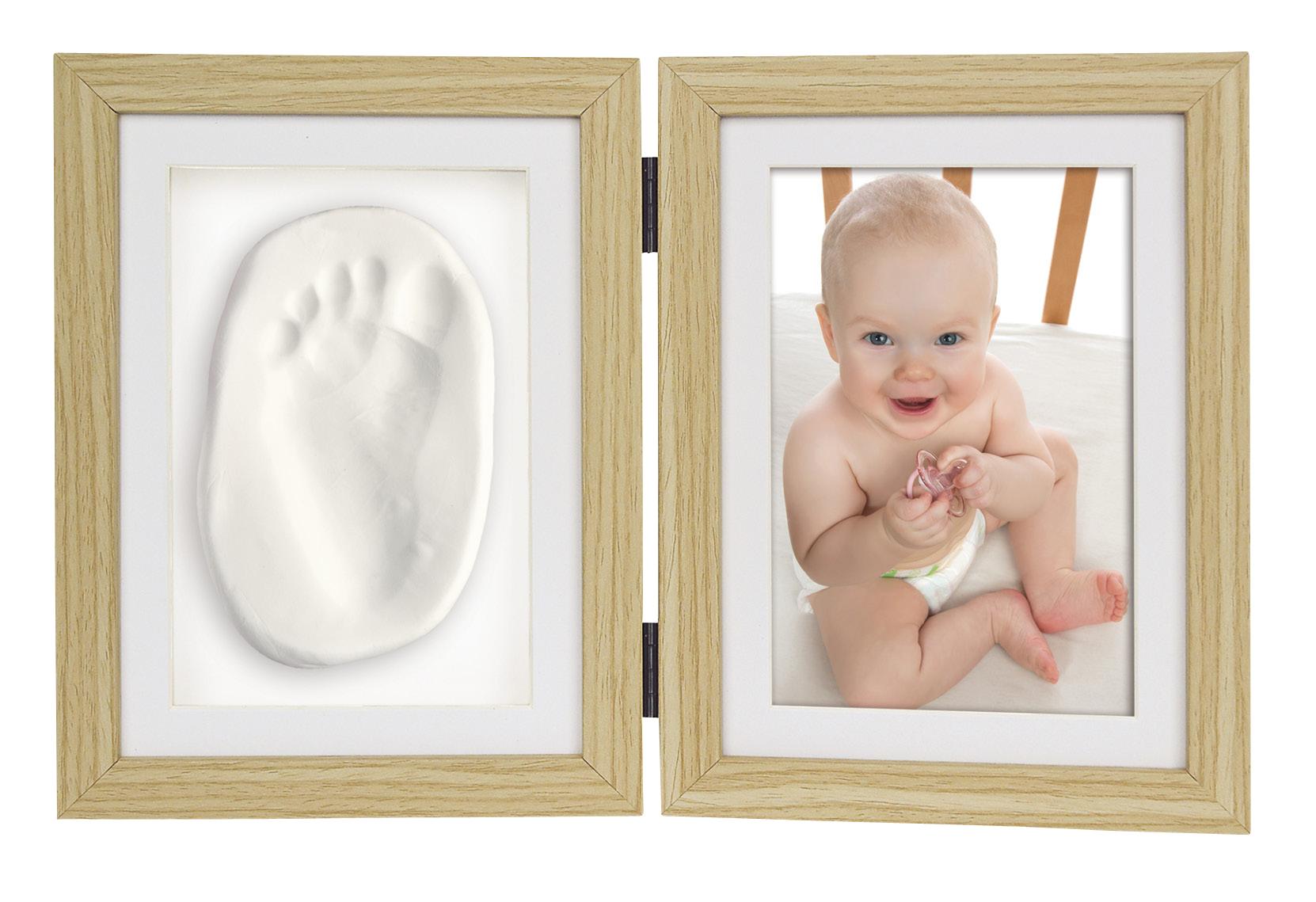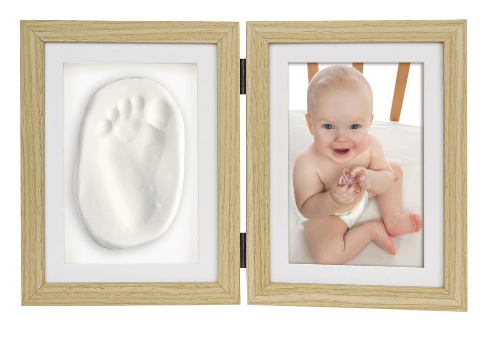 Give someone a pleasant surprise when you show them this beautiful folding picture frame which has room for both a photo of your child and a hand- or footprint of theirs! The picture frame is made of wood, is held together by hinges, and has two apertures. Included is a plaster kit with which you can create a cute hand- or footprint.