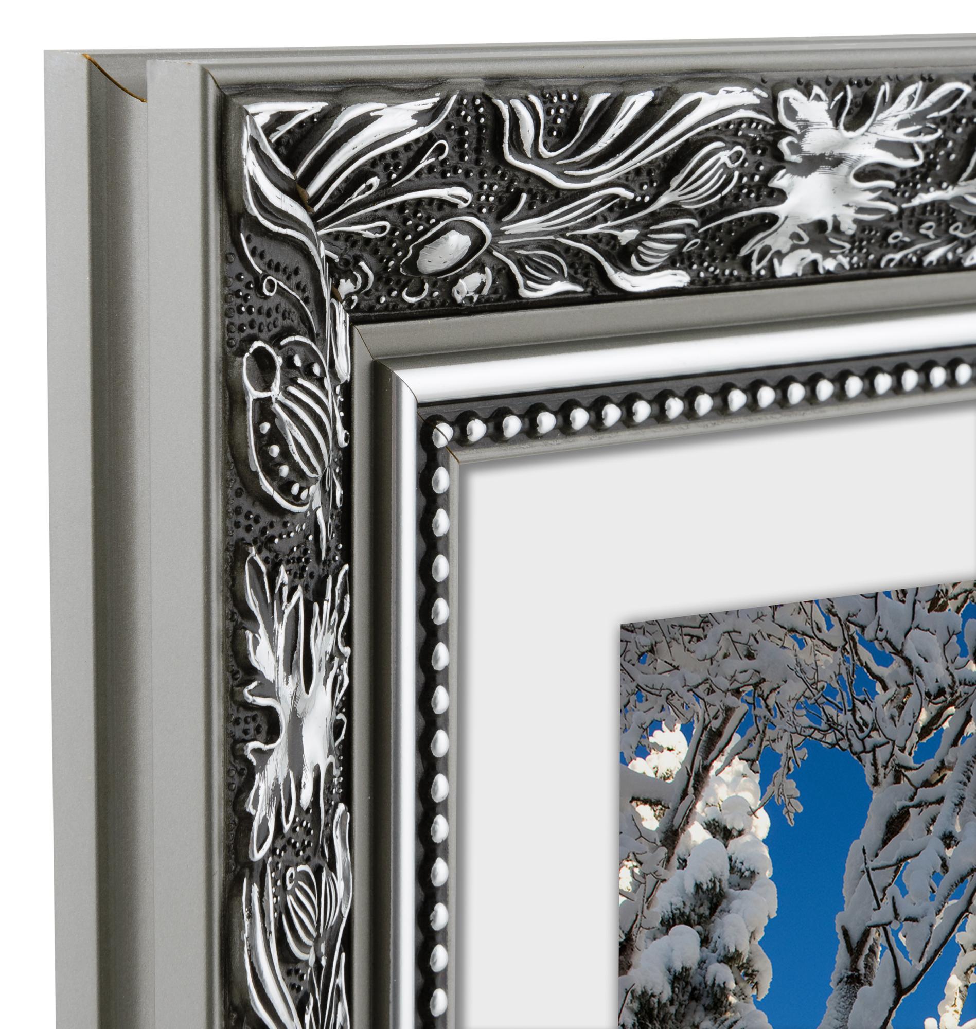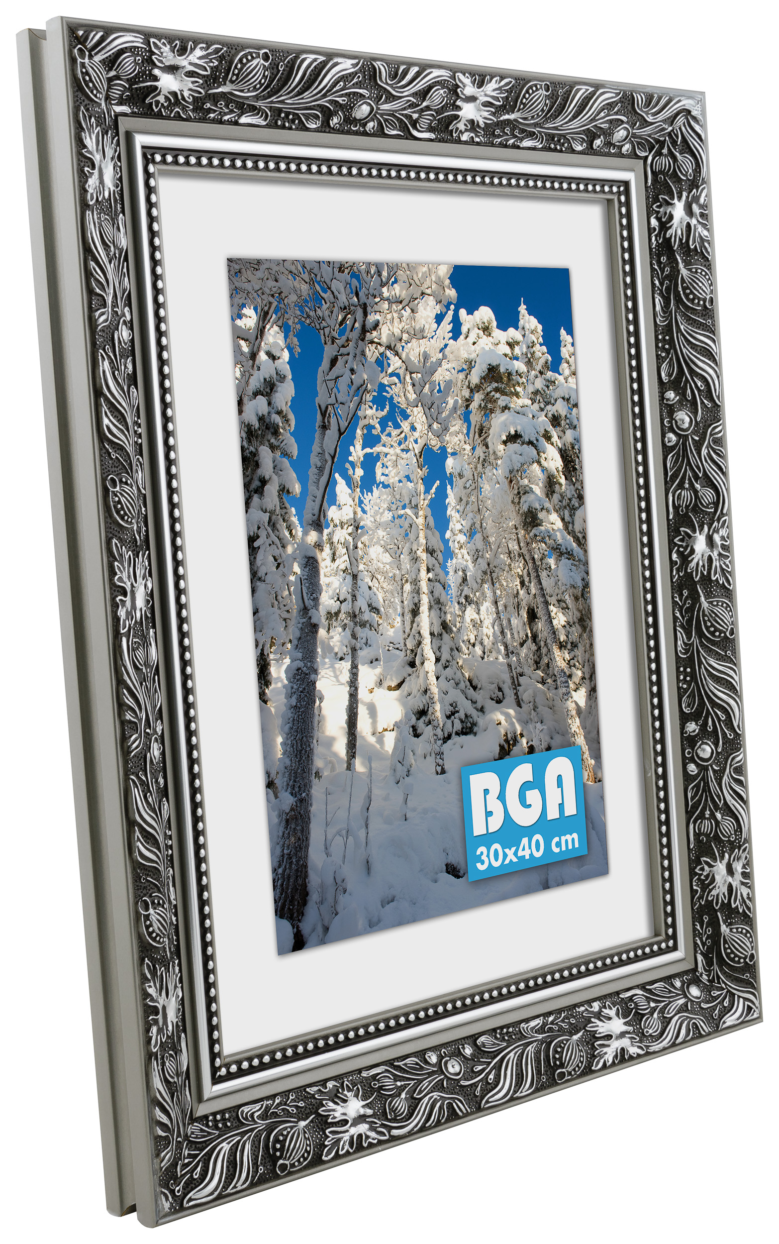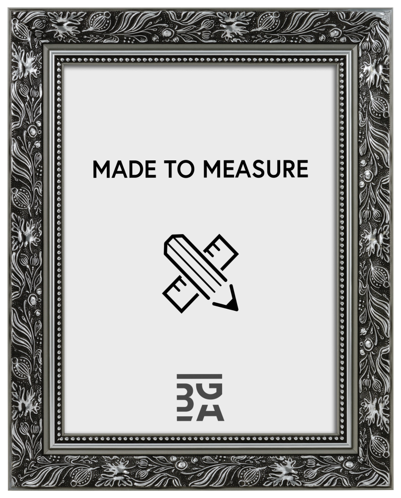 Make your walls luxurious at the same time as you draw extra attention to your pictures! This beautiful picture frame has a double edge, meaning it looks really great on the wall. The edges are wholly silver, while the front is black and has a silver-coloured pattern with edges and coiled shapes. Around the glass runs a silver edge and a black line with a silver pearl pattern. Because the picture frame is produced according to the dimensions you desire, it will fit exactly where you want it.