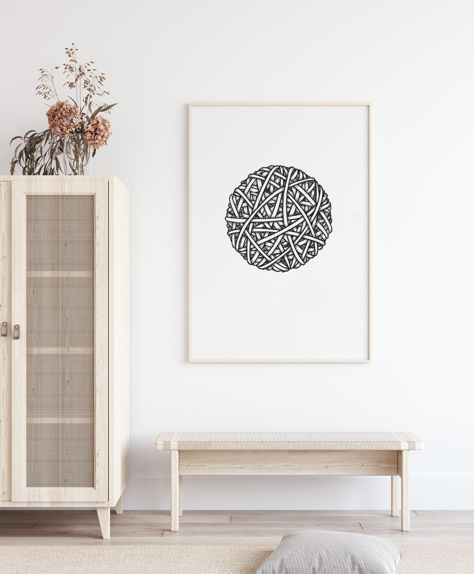 A graphic poster in black and white of a skein shaped like a ball. A simple and minimalist painting that fits excellently to mix with other lovely favourites in a larger collage.