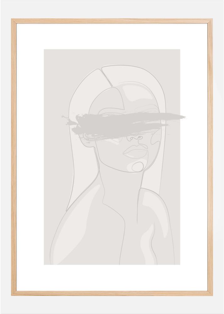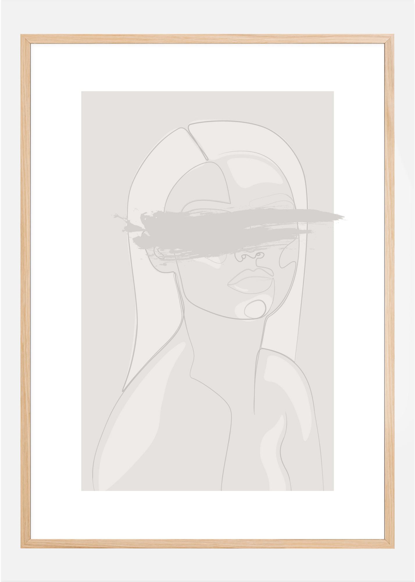 An abstract poster of a woman with her eyes blocked out. This pale white and grey piece outlines a woman's head and shoulders in block shapes and lines. A splash of paint covers her eyes creating mystery around the woman. A strong white border frames her, perfect for adding to a bold solid colour wall at home.
