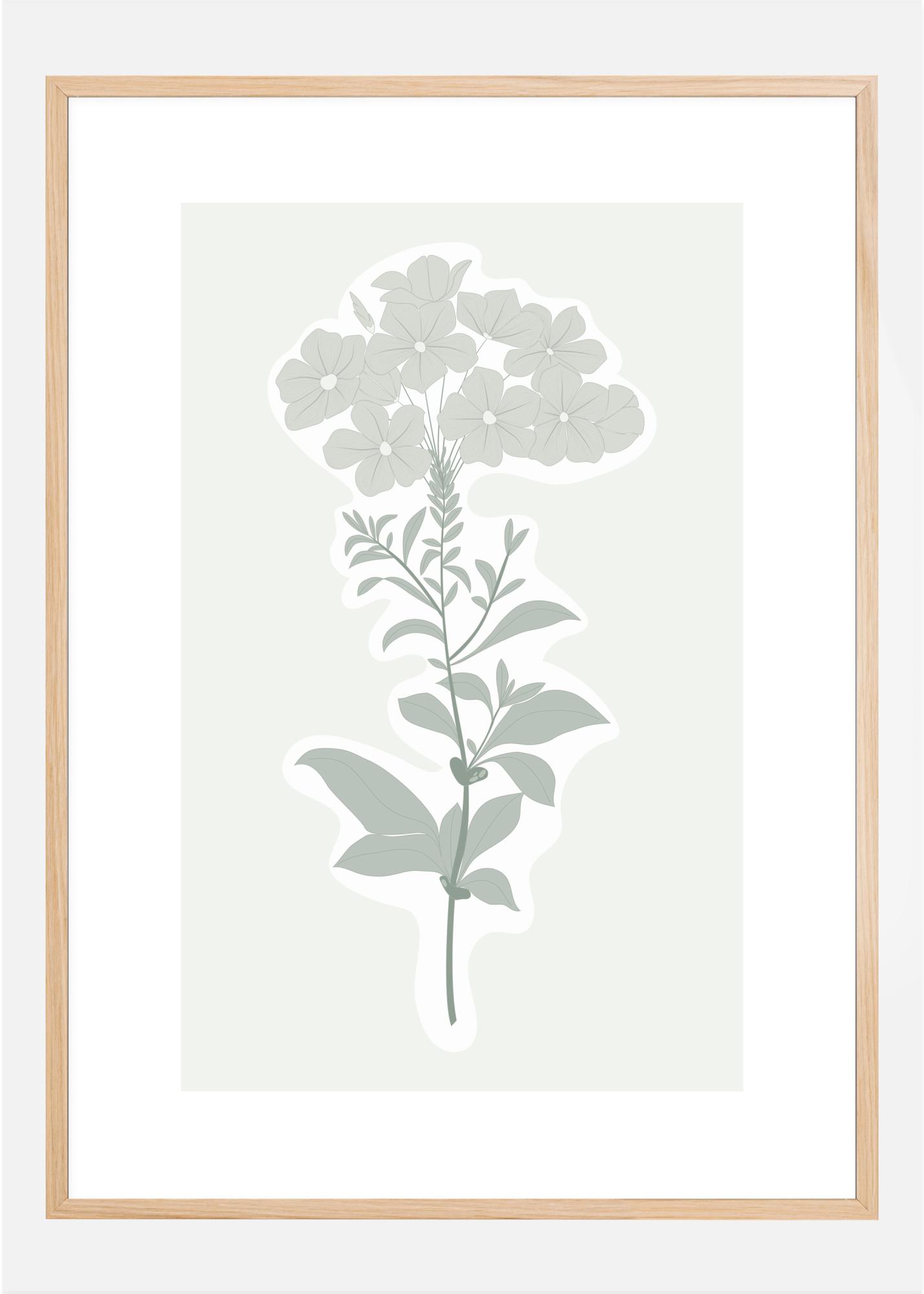 A floral poster with a simple botanical print of a flower and its leaves. Soft grey green colours make up this simple, yet elegant, stem with flowers. Framed in white then grey, this brings to life old-style botanical illustrations. Show off your gardening site with this adorable print.