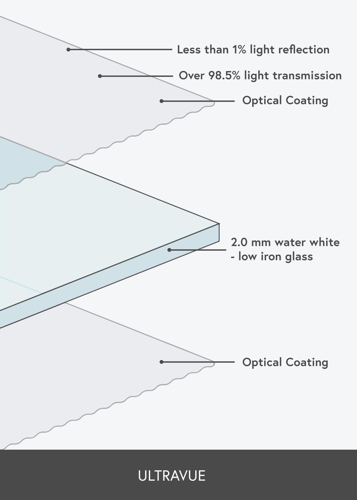 Avoid disturbing reflections and glare, with a genuine reflective glass from Tru Vue. With a degree of reflection at only 1%, the glass becomes almost invisible, giving your images natural colours and a true lustre. As a bonus, the glass is also UV-protective and removes 70% of the harmful UV rays, which means that your images last a long time. UltraVue is also scratch resistant.