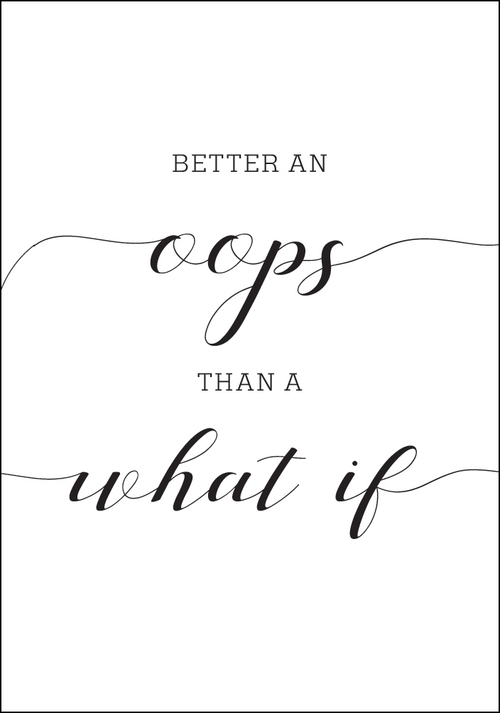 A motivational poster with type writing font and calligraphic writing. Better an oops than a what if is a strong motivational phrase that everyone deserves to see. Add this black and white print to a bold colour wall and remind yourself to live life to the full each day.