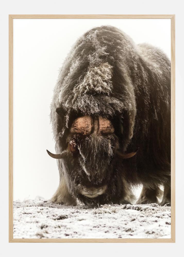 A wildlife poster of a snow-covered yak. The long brown fur of the yak looks soft and lush as he faces the camera searching for food. The snow white background makes him stand out adding drama to the image. Put this on your wall for a touch of winter.