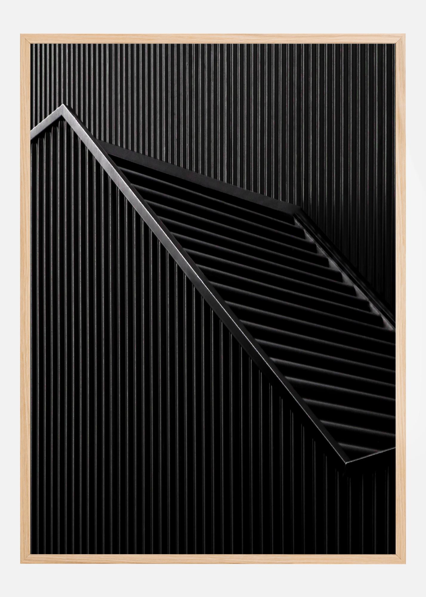 A geometric poster of a set of stairs, or rooftop, against a wall. This black and white shot is almost an Escher painting. Follow the lines of the wood grain as they intersect at different angles around the piece for compelling viewing. Place on a white wall for a dramatic effect.