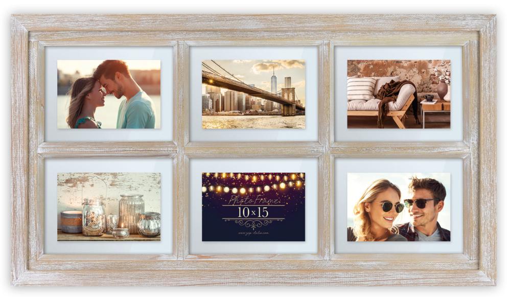 Landscape collage picture frame made from light wood. This is a picture frame with space for 6 photos measuring 10x15 cm. This frame lets you easily arrange a group of pictures together in a nice, aesthetic way. This picture frame has wooden lines which give it a rustic, and somewhat rural, look. This frame's outer measurements are 38,5x69,5 cm. Comes with wall fixings.