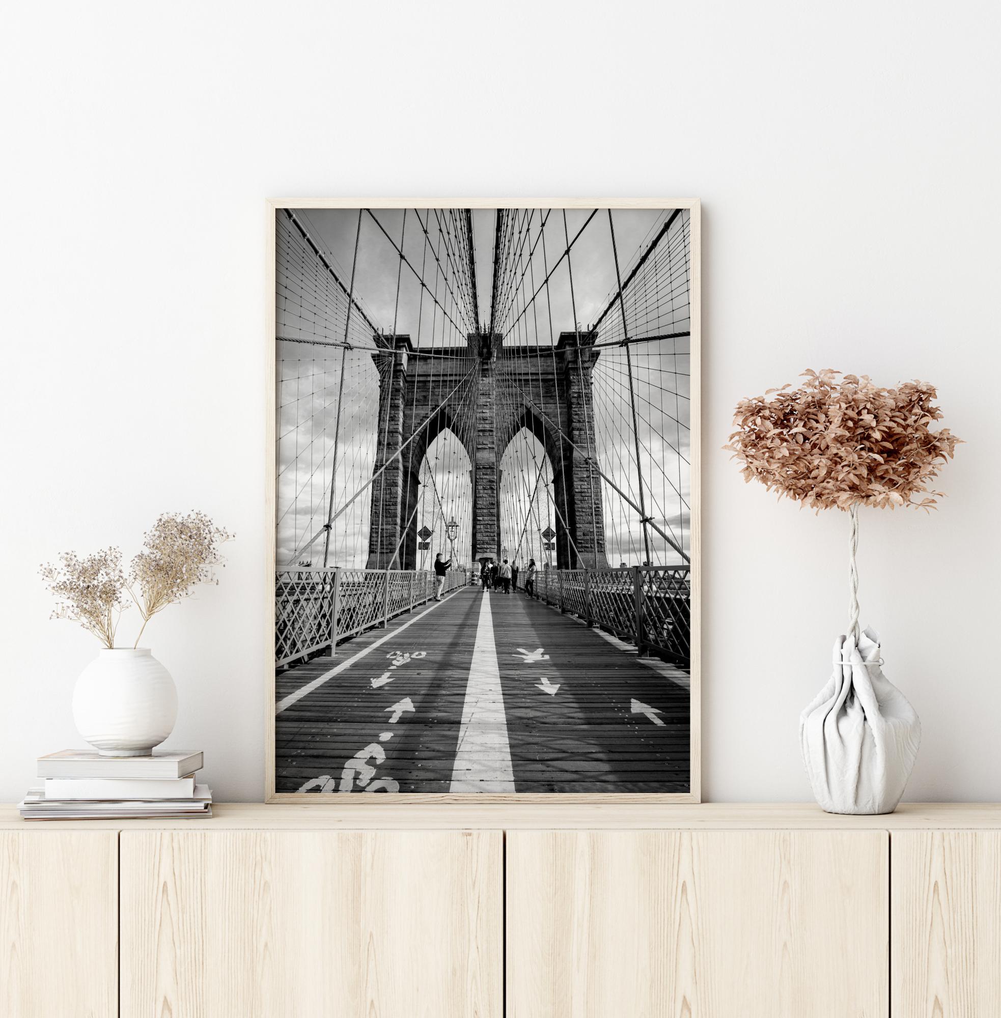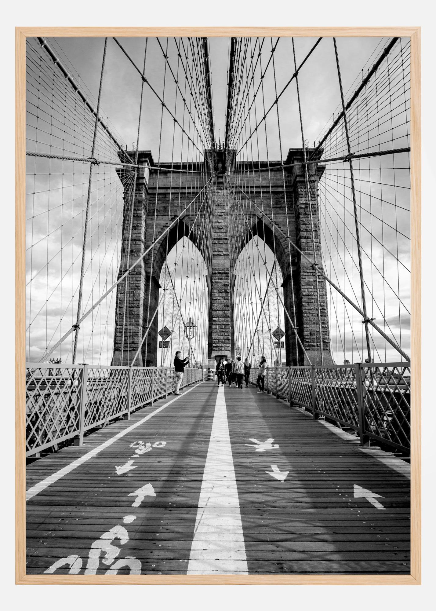 A black and white photograph of the Brooklyn Bridge's walkway, majestic towers, and intriguing suspension system in the form of steel wires in large grids. A poster that excels in combination with other favourites in a larger collage.