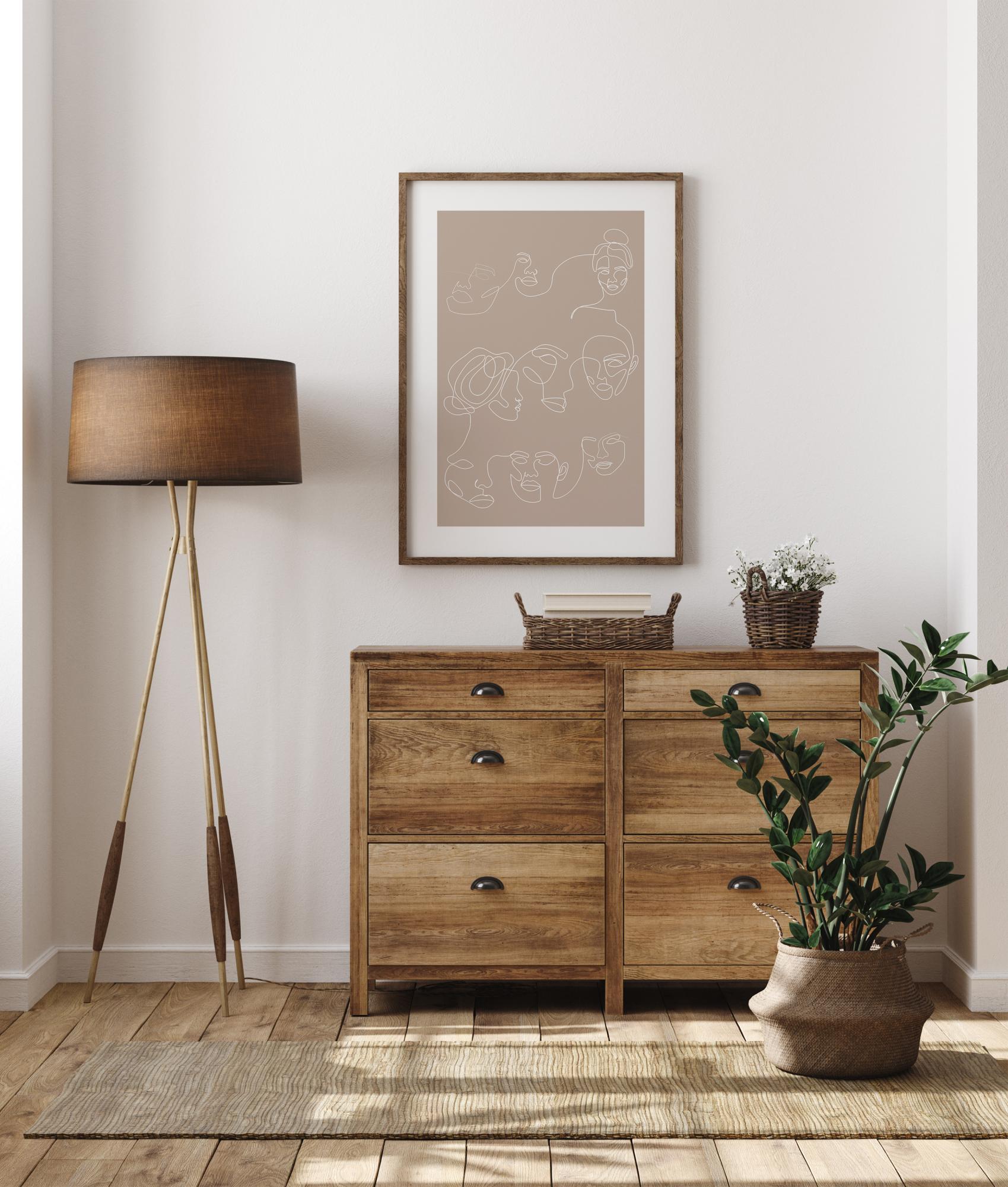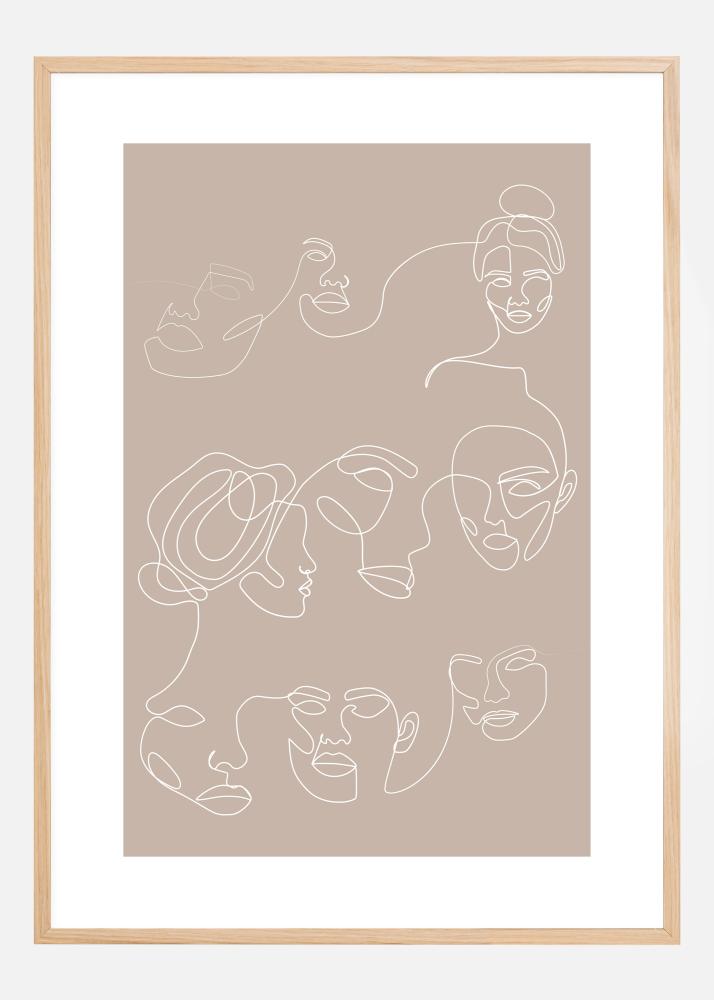 A sketchbook poster with a number of different abstractly drawn heads and faces. These abstract heads have all been drawn using a single line, so they all join together in a long line. The white lines on the beige background would work with any bold colour wall for an artistic vibe.