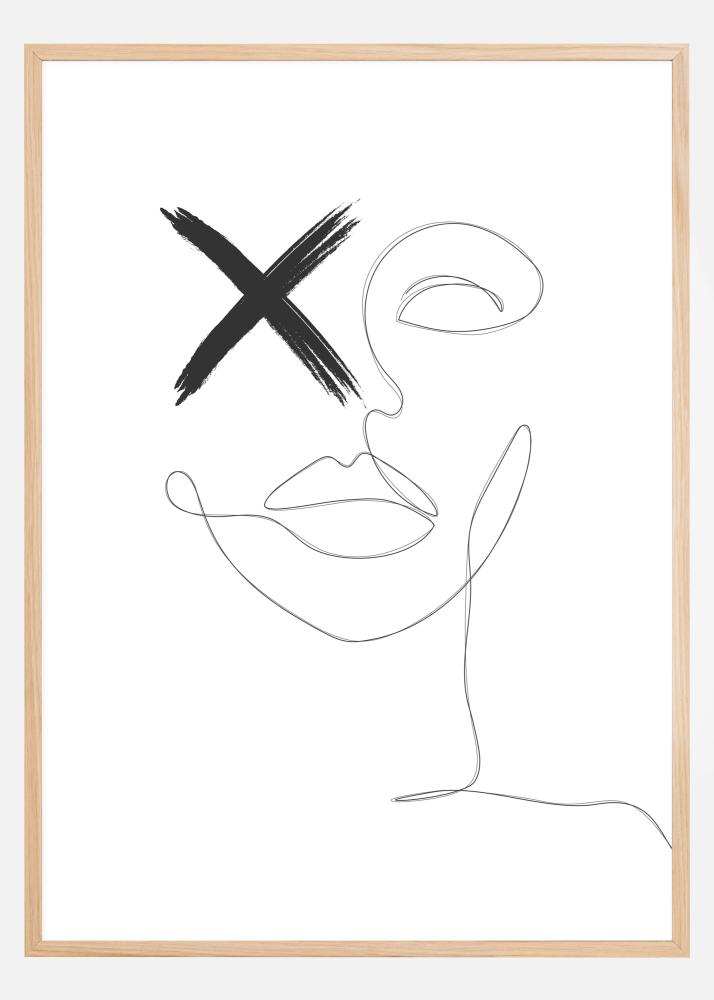 An abstract poster of a face drawn with a thin black line on a bright white background. The line is joined in one fluid motion to draw the face. Over one eye is a large black cross. Hang this on a colourful wall as a great talking point in your home.