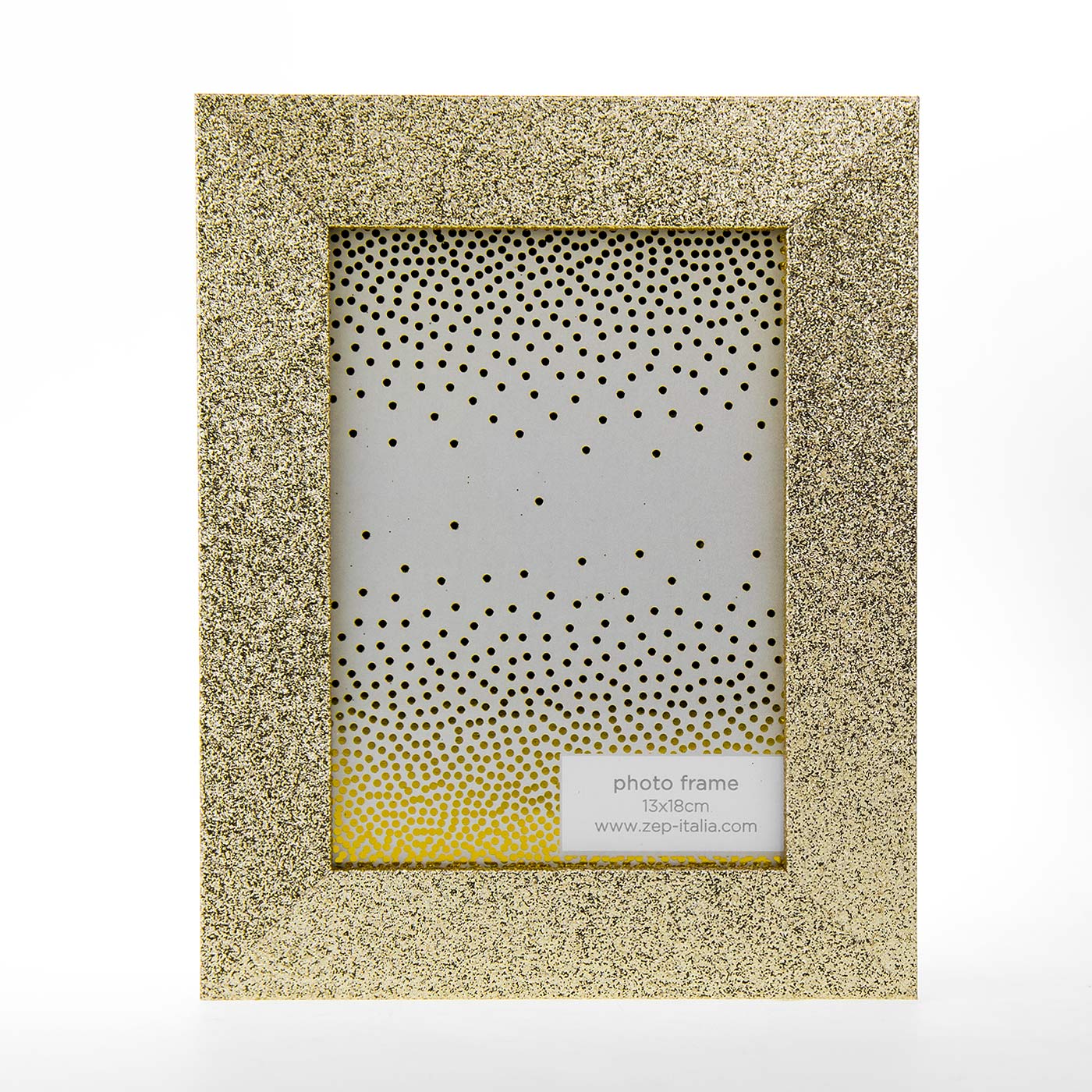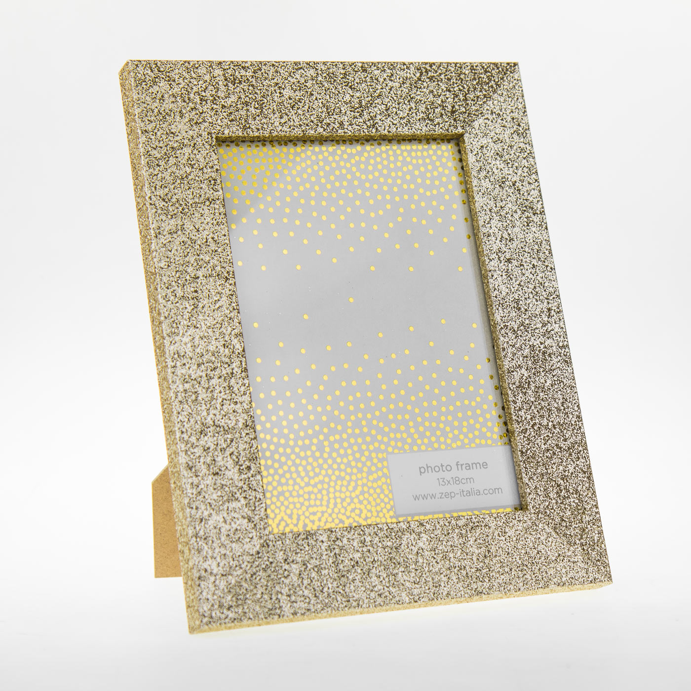 Give your photos a touch of luxury with this elegant 13x18 cm gold-colored photo frame. Its glittery surface captures the light and creates a shiny effect that will draw all eyes to it. This picture frame is not only a framing for your photos, it is also a decorative detail in itself.