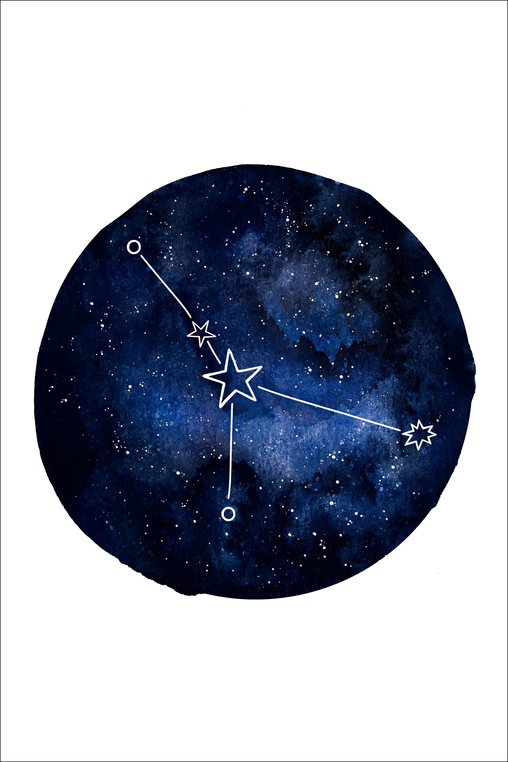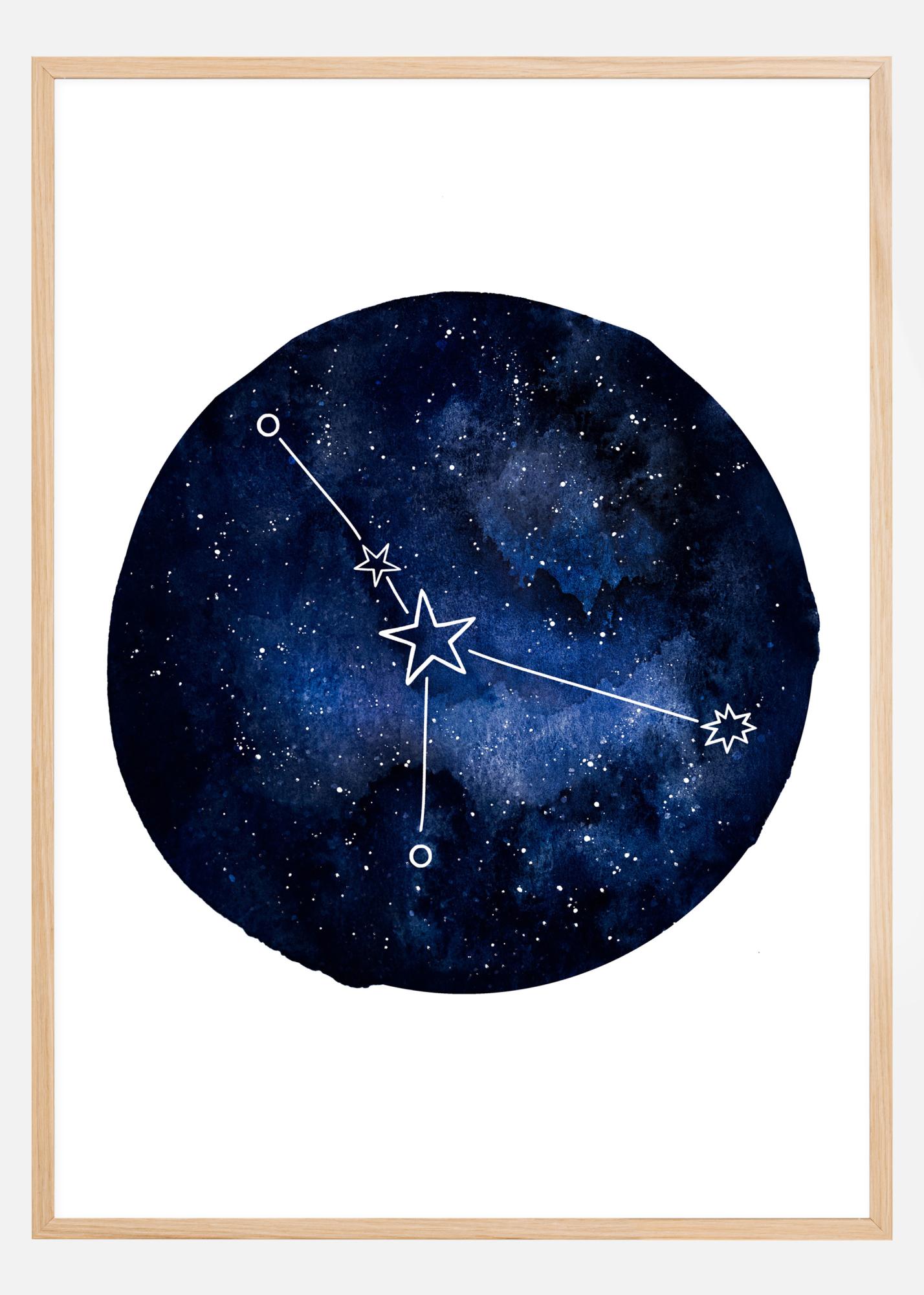 A horoscope poster of Cancer. A dark blue circle fills the centre of this white image. In the circle are different shades of blue as well as different stars. The zodiac sign Cancer is prominent in the centre. If you love your star sign, add this to your wall.