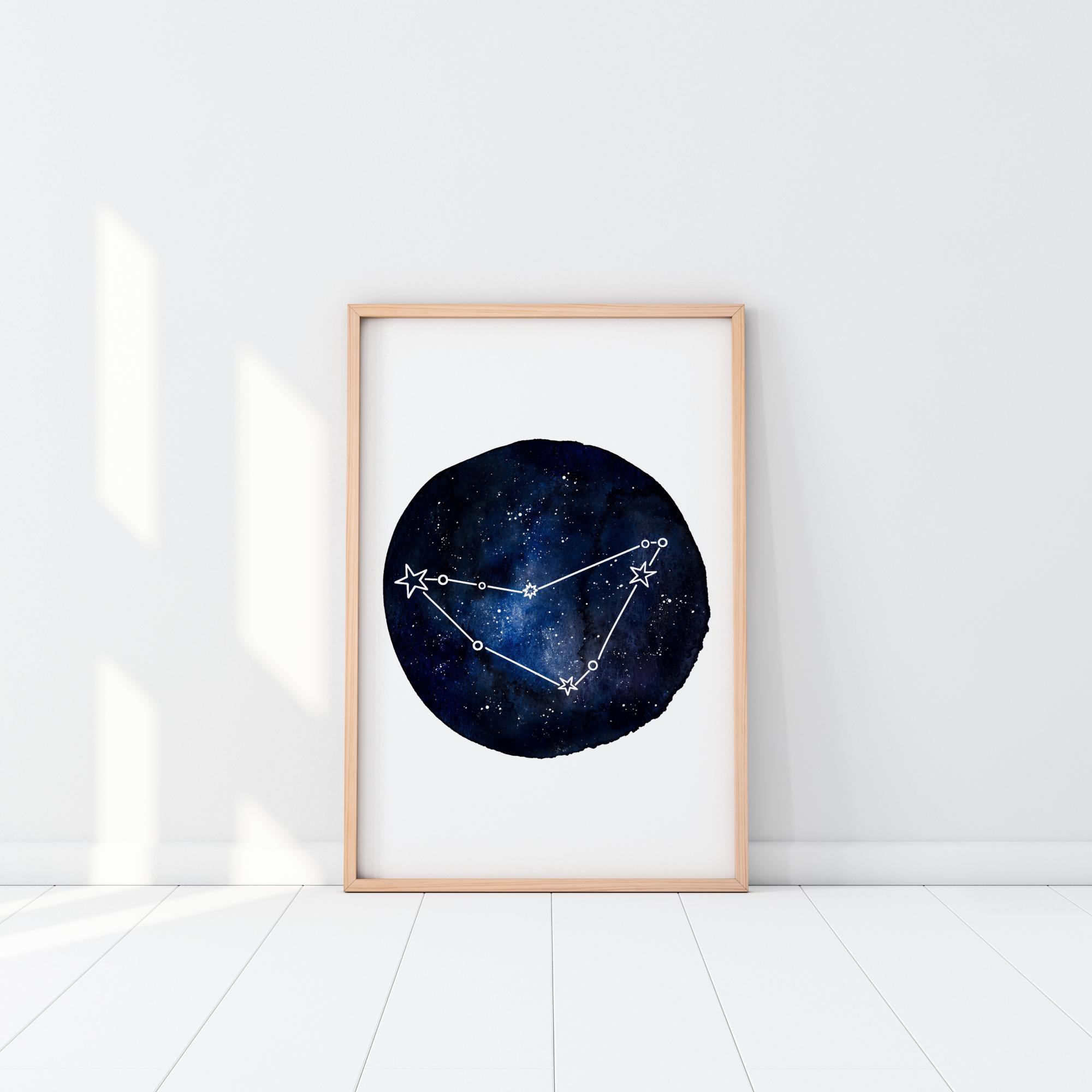 A horoscope poster of Capricorn. A dark blue circle sits in the centre of a white background. In the circle are a variety of blue tones as well as stars. The main constellation is the Capricorn zodiac sign. So, grab this to hang up if you enjoy your star sign.