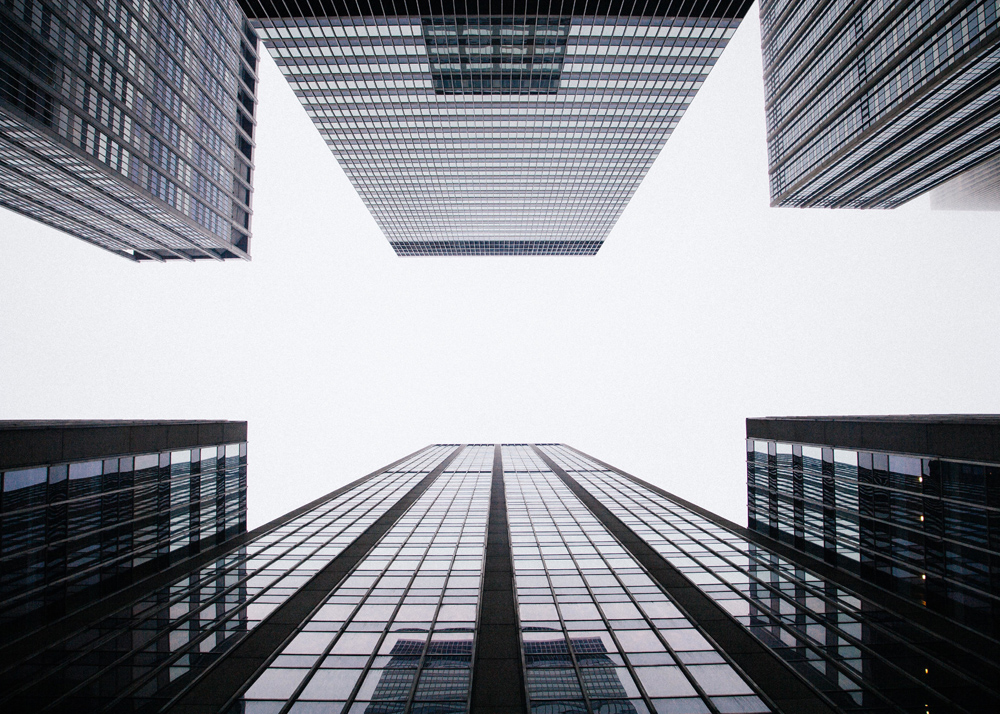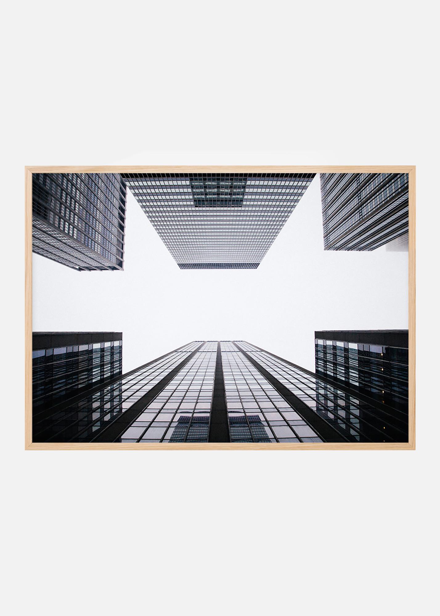 Architecture posters featuring growing skyscrapers against a cloud-white sky. A sleek image of dark buildings against a white background, with reflections of the sky in the glass panes. The perfect gift for someone who likes graphic architectural portraits. The print looks great in a black frame that enhances the darkness of the image and looks nice in combination with other photographs of architecture.