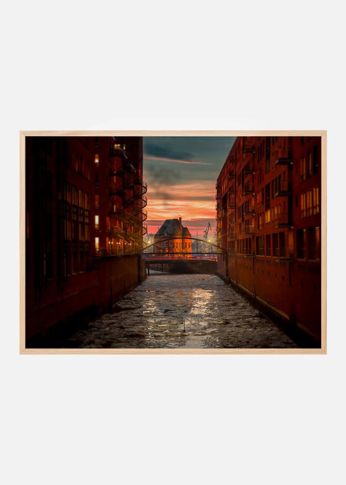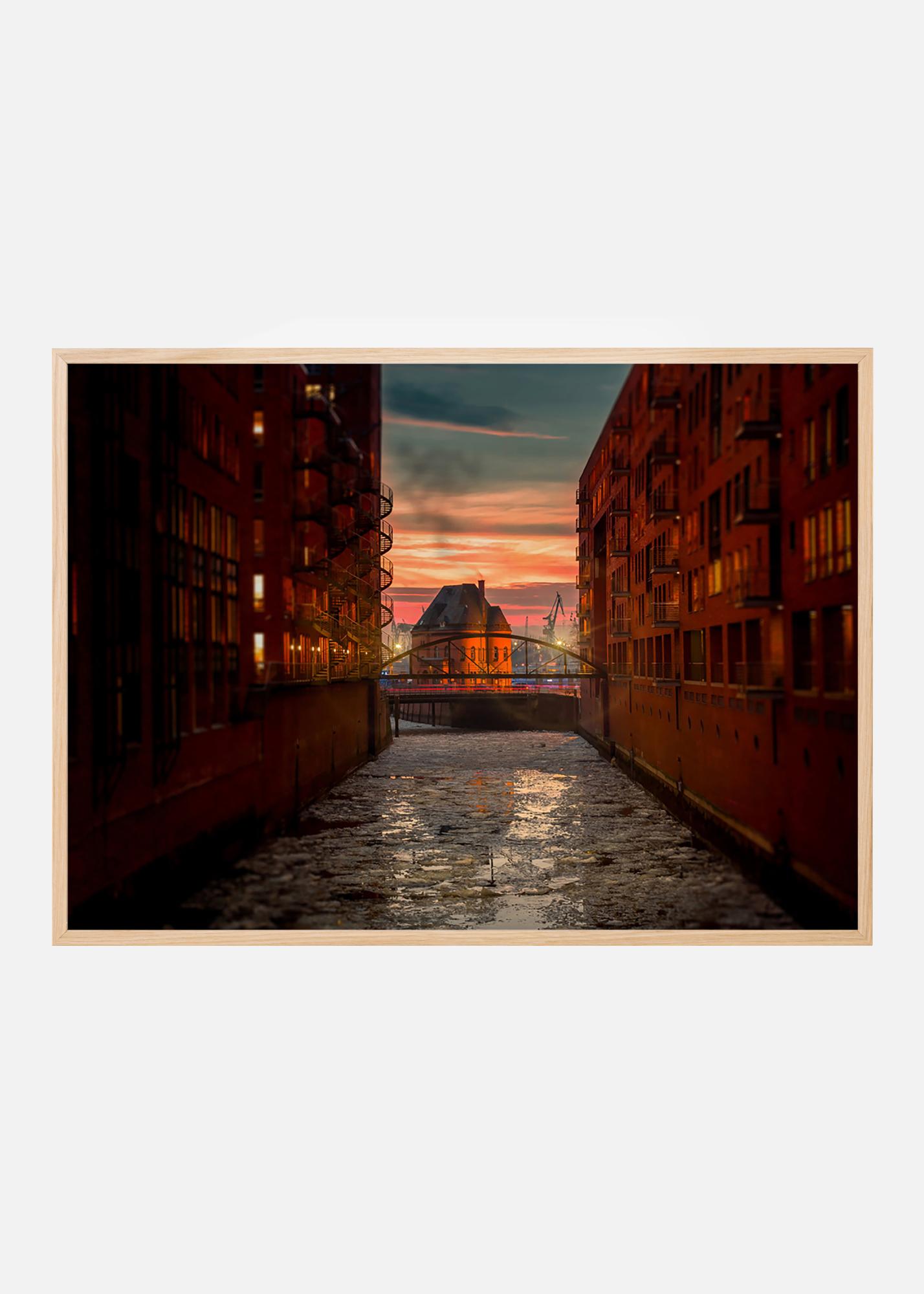 Sunset over the old warehouse district Speicherstadt in Hamburg with its canals and neo-Gothic brick buildings. The photograph from the heritage-protected area fits nicely in the home of someone interested in architecture or history. The poster is best suited in a thin metal frame that matches the strict architecture and looks stylish on the wall together with other city images.