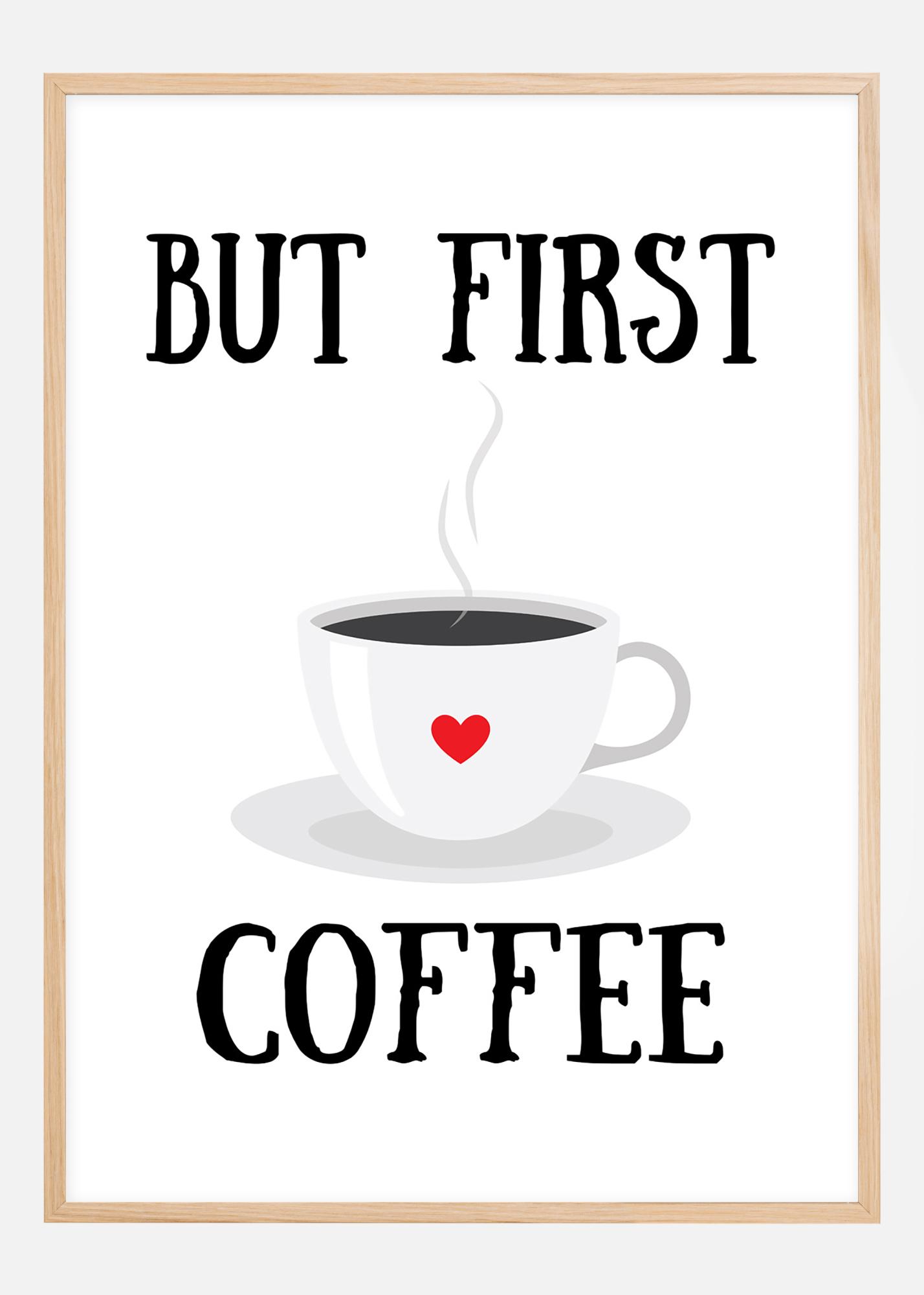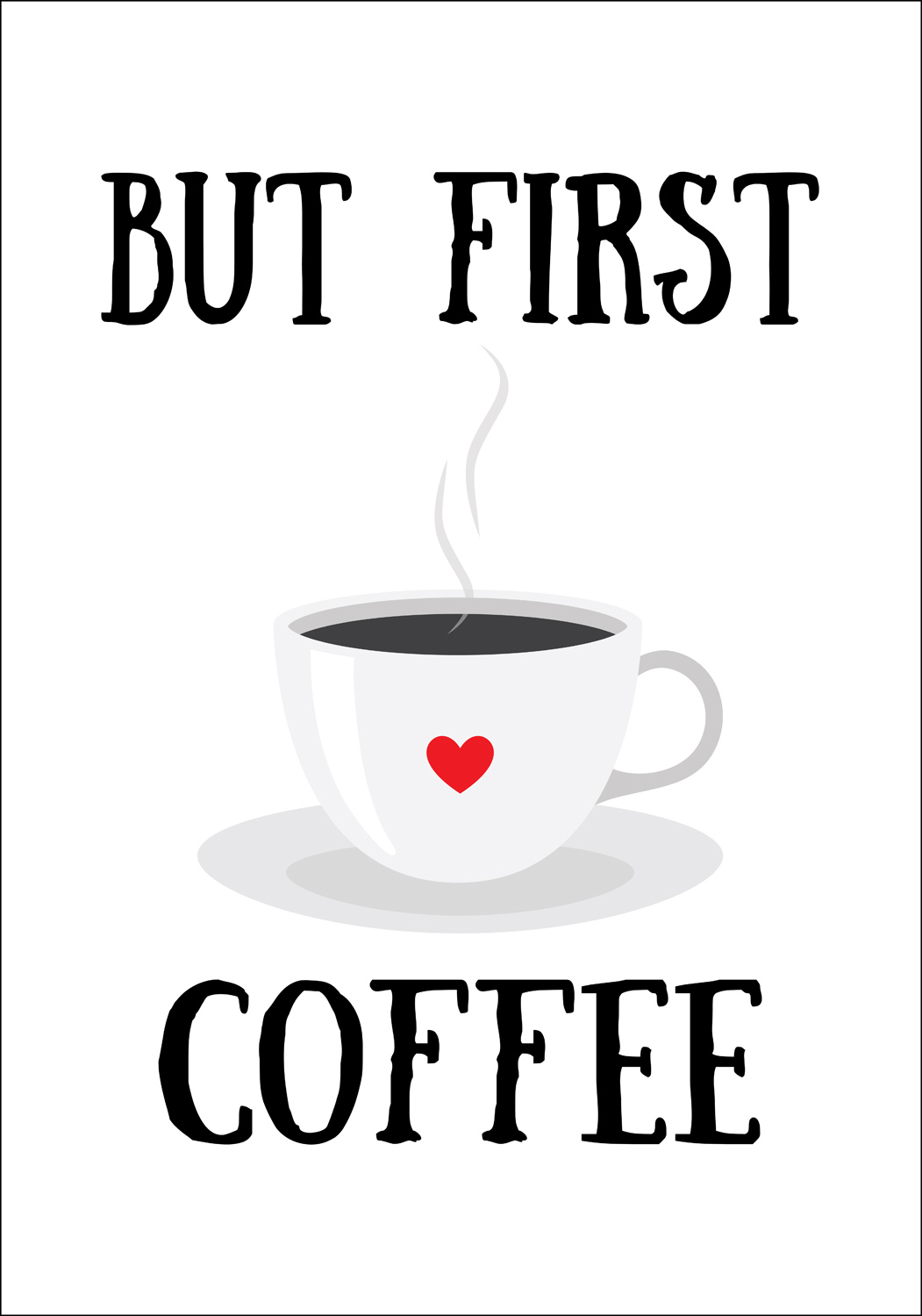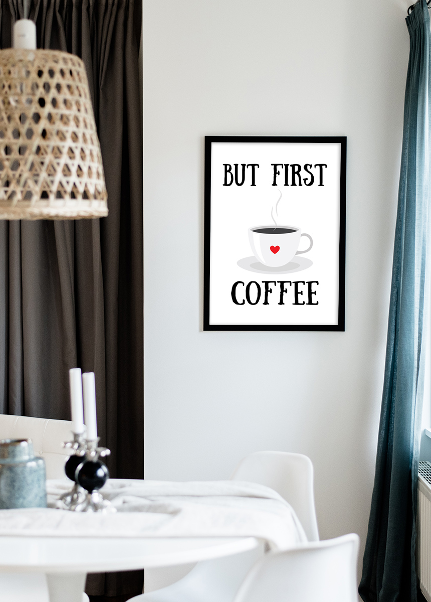 Poster with an illustration of a coffee cup with a message for the coffee-loving individual. The sweet design featuring a heart on the cup makes a lovely gift and fits well when hung in the kitchen in a country or retro-inspired decor. Complement the poster with a picture frame that matches the style of the illustration and the overall decor to create a cohesive feel in the home.