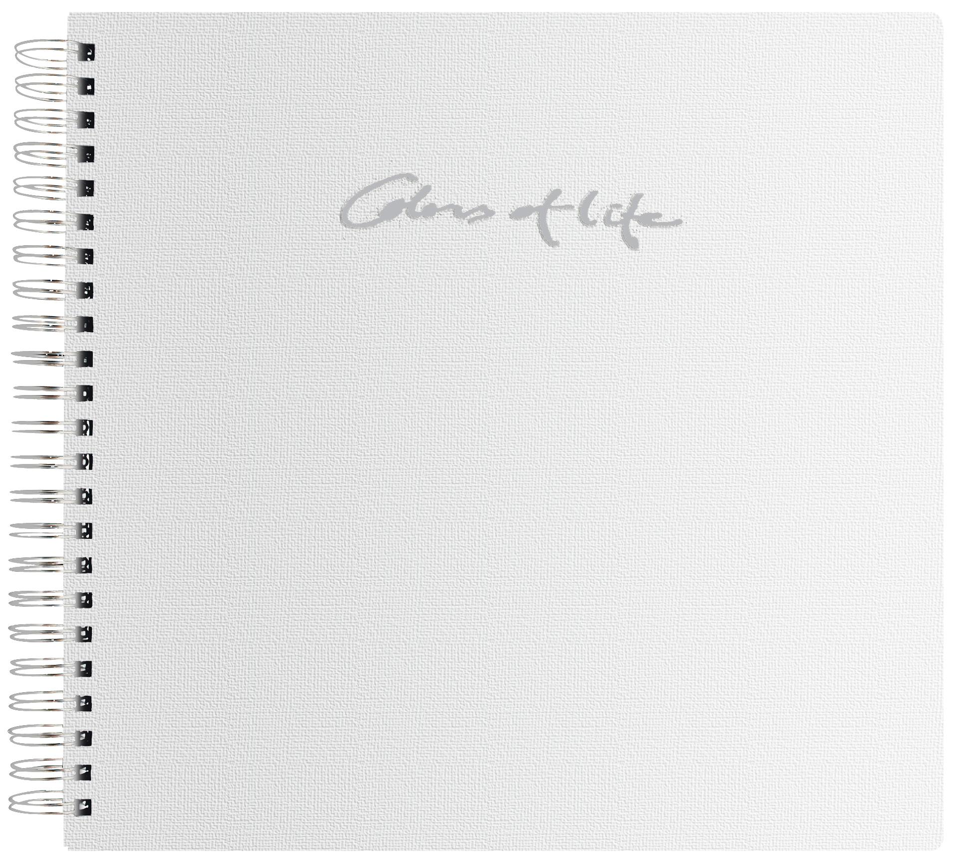 A 30x30 cm spiral photo album with 24 acid-free white sheets, ready to be filled with treasured memories! With the text "Colors of life" printed in silver on the front of the album.