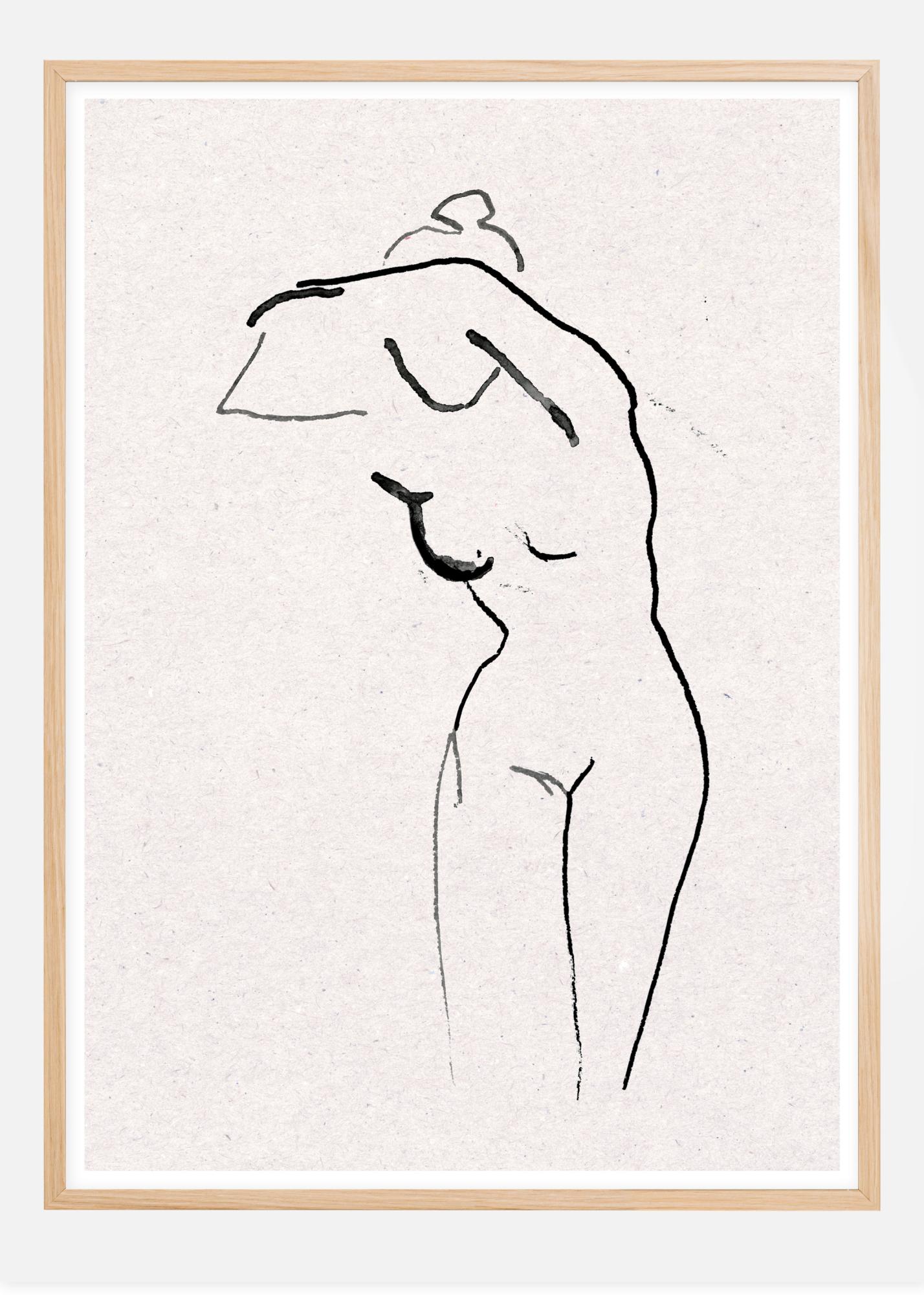 A graphic art poster in watercolour created by Cora Art and Illustration. Here, a woman takes shape in thin black lines against a light grey background. The delicate motif is then surrounded by a slightly narrower white mount.