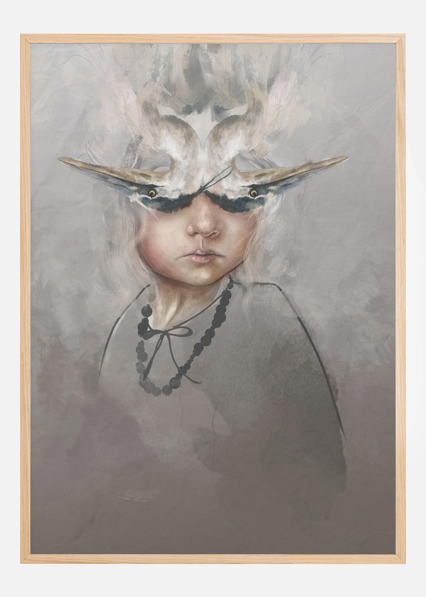 An eerie poster of a person shrouded in smoke. The head is covered in a hat that seems to be on fire and looks like two upside-down birds or a skull. The eyes are mysteriously covered with shades as the figure maintains its cool. Add this piece to your house for some next level interpretations.