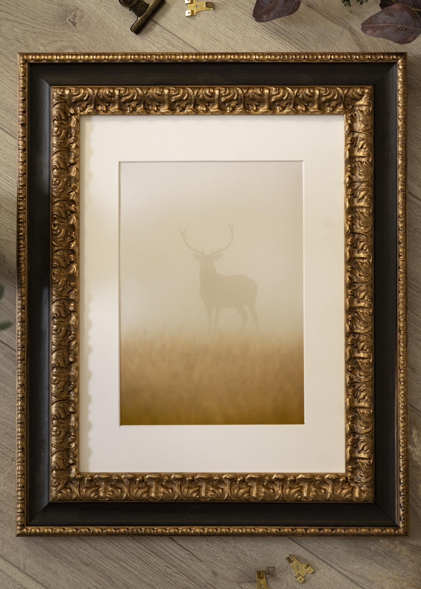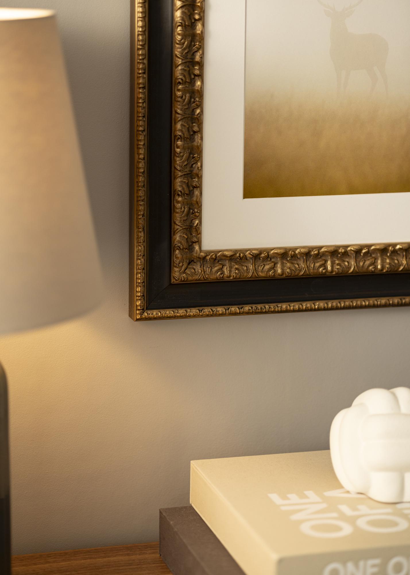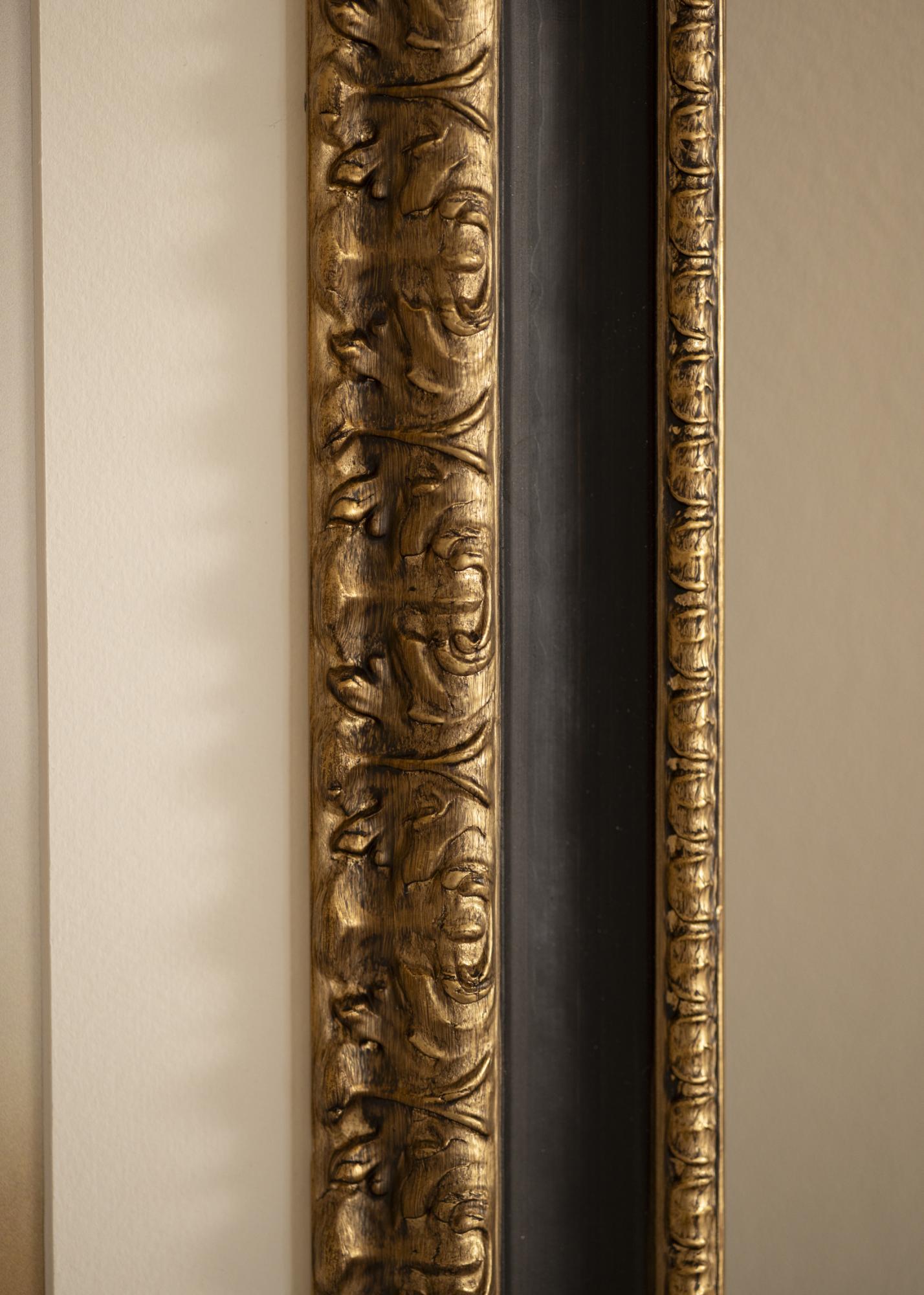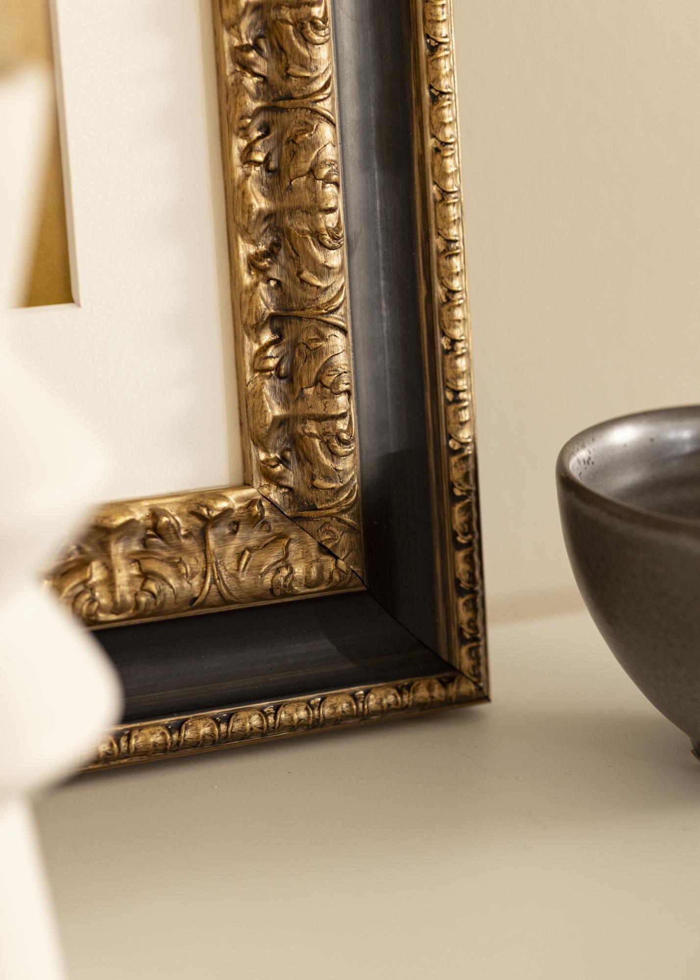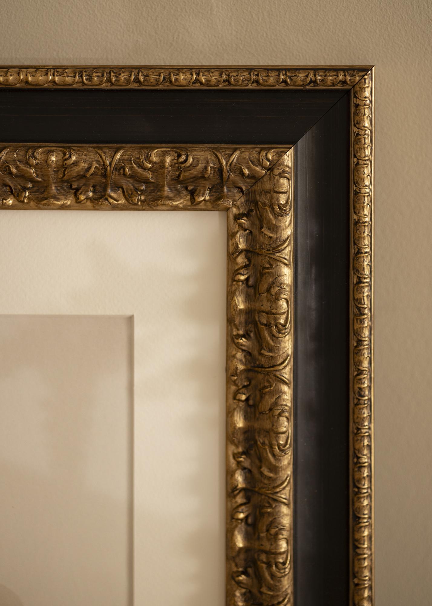 "Drottningholm Gold" is a beautiful Italian retro picture frame with hand-painted, hand-spliced pine. The picture frame has a richly decorated golden edge with a wide black strip around the outside, giving this picture frame its elegant feeling. Perfect for framing anything in a retro style.