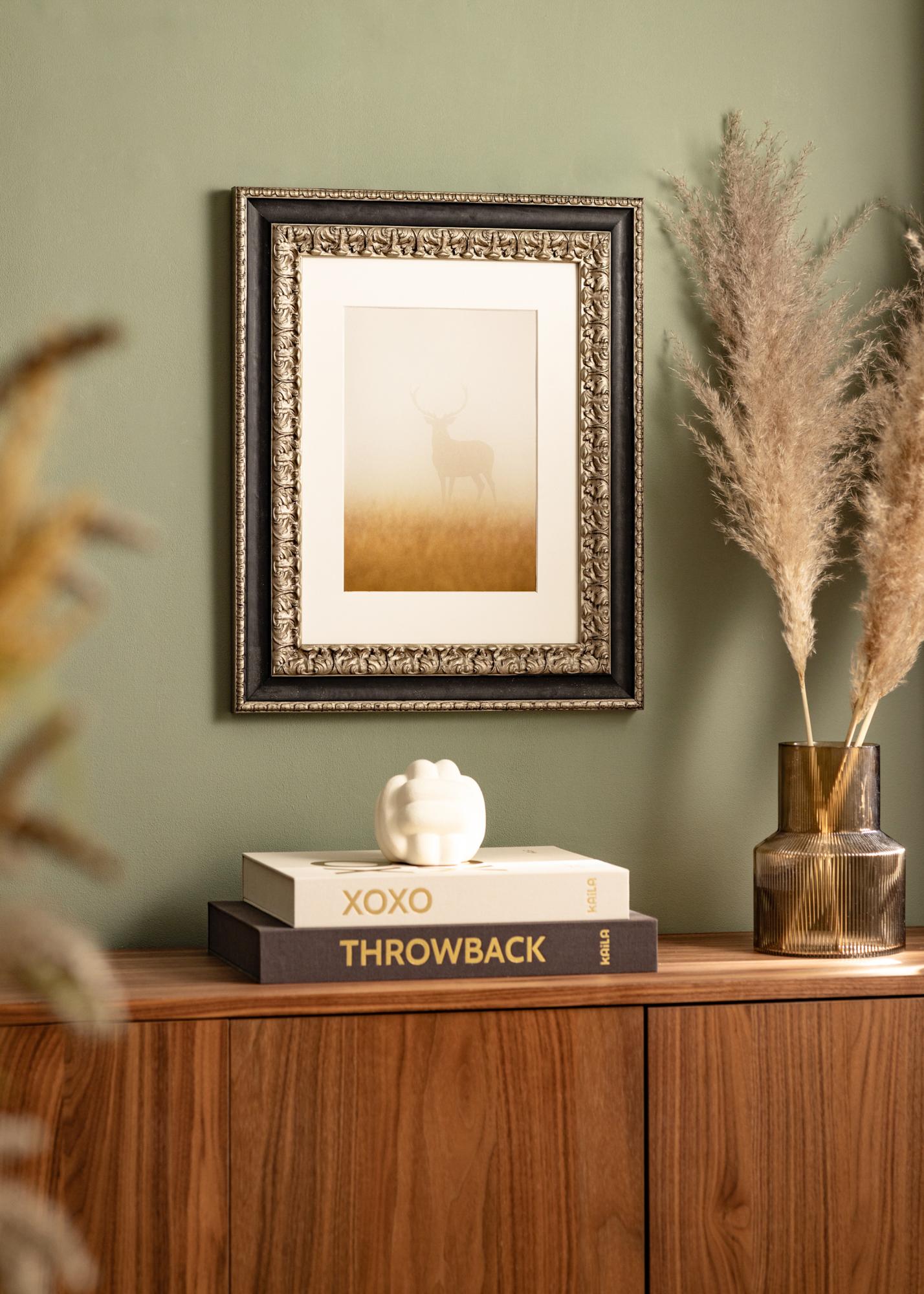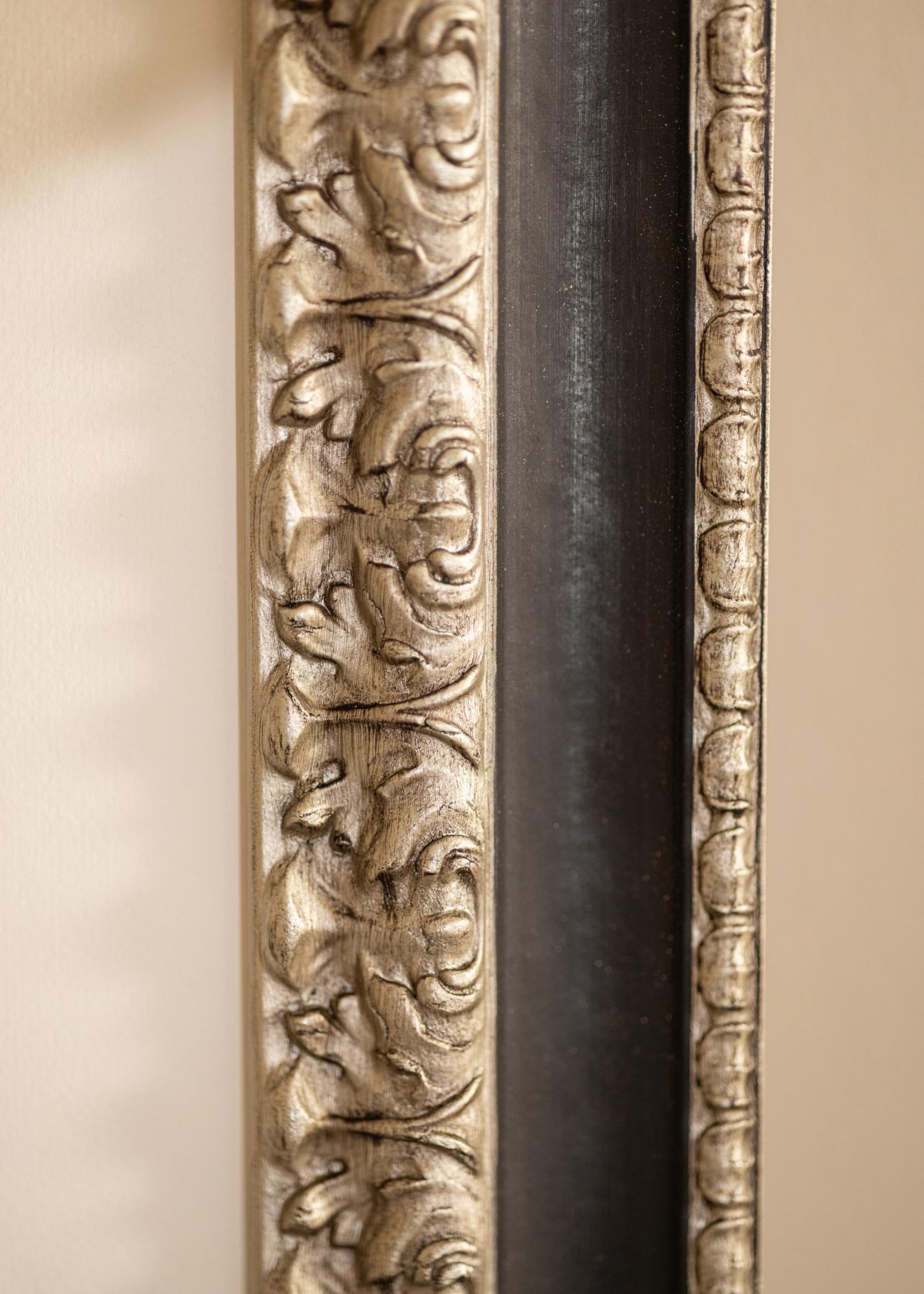 "Drottningholm Silver" is a beautiful Italian retro picture frame with hand-painted, hand-spliced pine. The picture frame has a richly decorated silver edge with a wide black strip around the outside, giving this picture frame its elegant feeling. Perfect for framing anything in a retro style.
