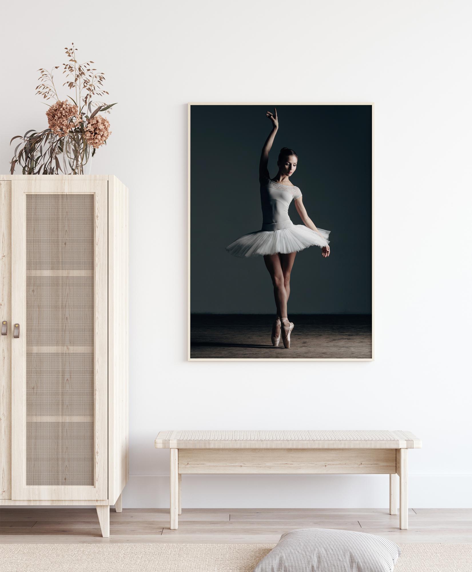 A photographic poster of a graceful ballet dancer standing on tiptoe with one arm stretched above her head. The lighting in the picture makes her face and white clothes contrast nicely against the slightly darker surroundings