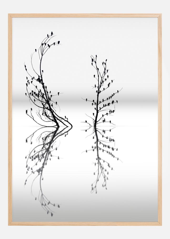 A simplistic poster of two branches reaching up out of some water. The dark branches bend and twist, casting their reflections on the still water below. The soft blue and white tones in this piece give an air of tranquility which you can enjoy when you have this at home.