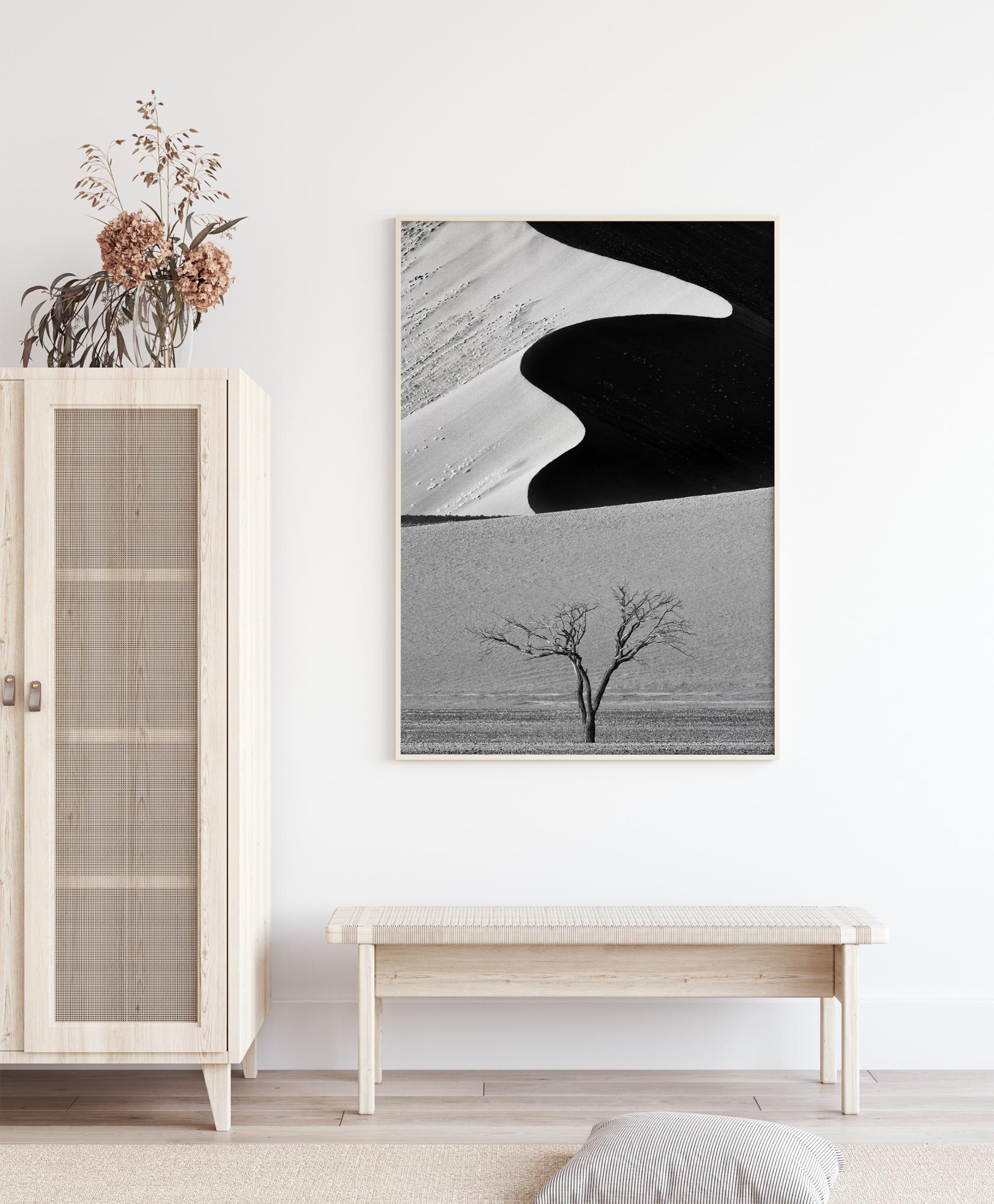 A dramatic poster of curving dunes with a lone tree. This stark image juxtaposes the black and white curves of the dune with the static stillness of the tree. Create an air of awe with this piece.