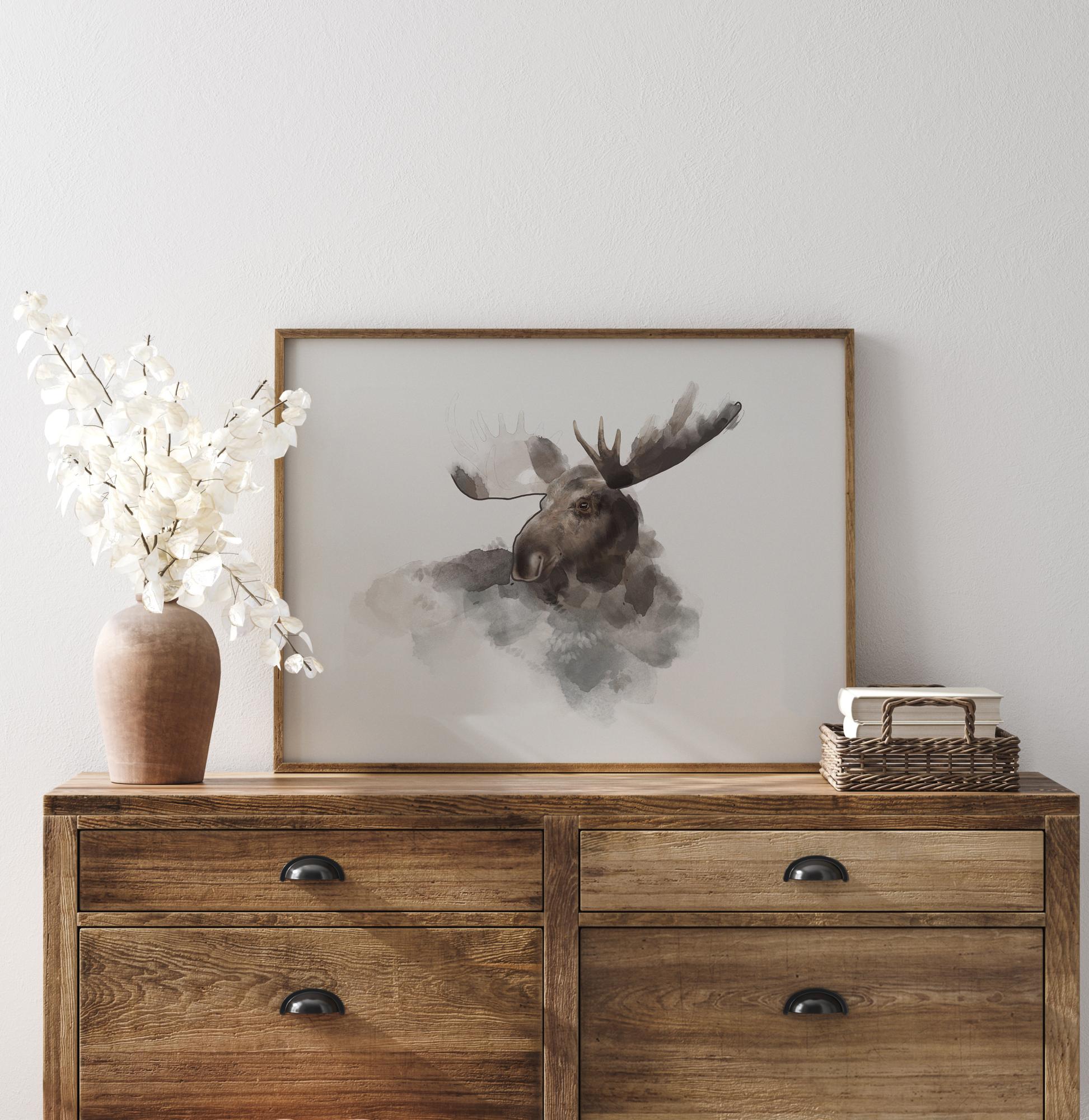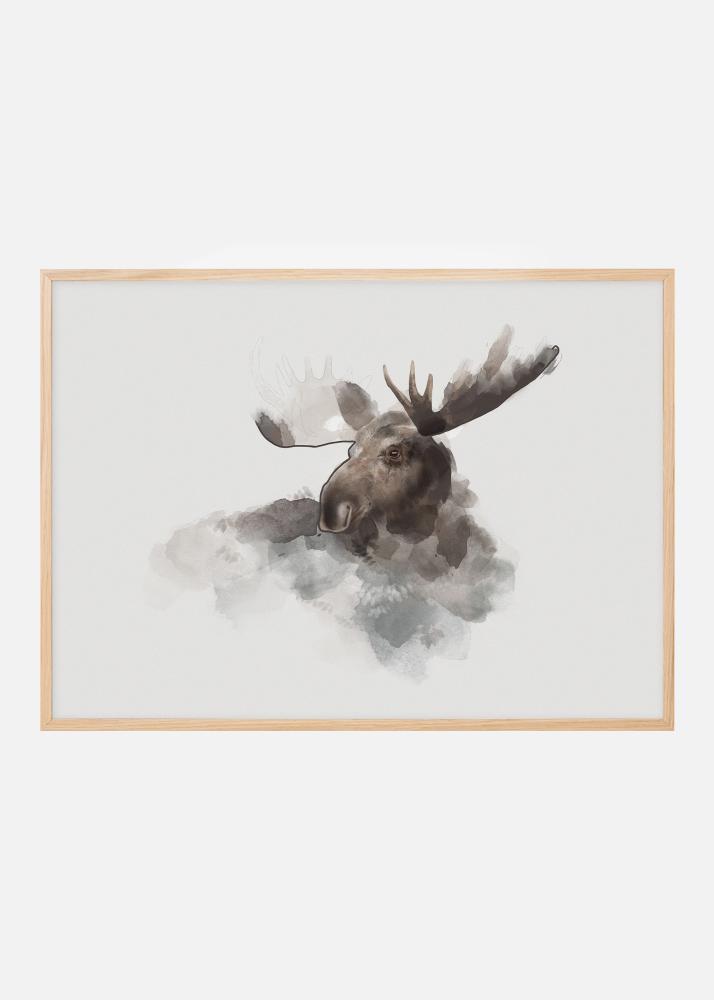 A watercolour poster of the head of a moose. The soft water brushstrokes gradually build up the face of the moose, his antlers still not fully formed. Add this cloudlike image to a soft neutral wall to keep that soft elegance in your home design.