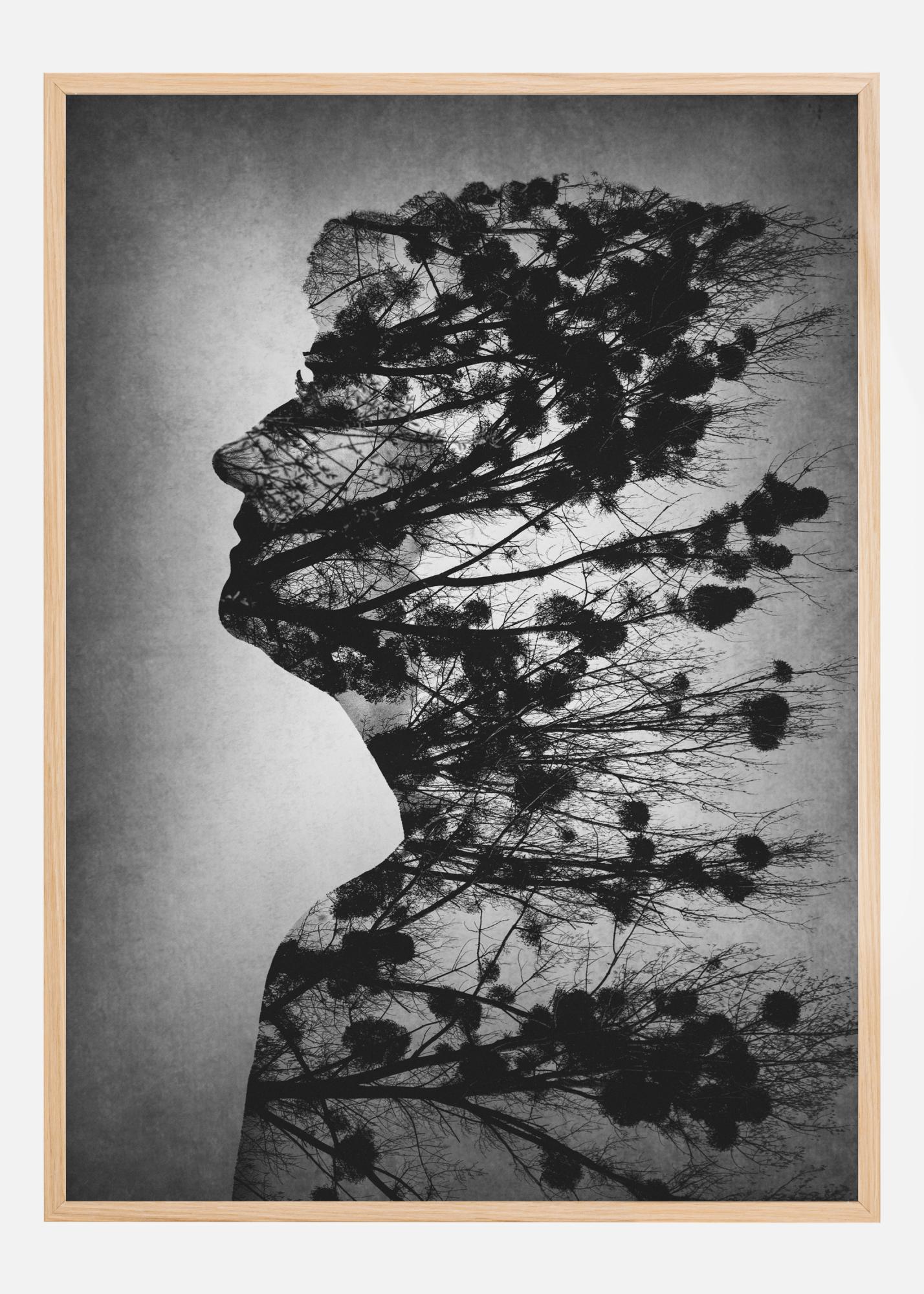 An abstract poster of a woman's face created by using different leaves and branches. In stunning black and white, this dramatic pose makes it feel like wind has blown these leaves across her face. Powerful backlight highlights her profile giving this a strong, but transparent feel.