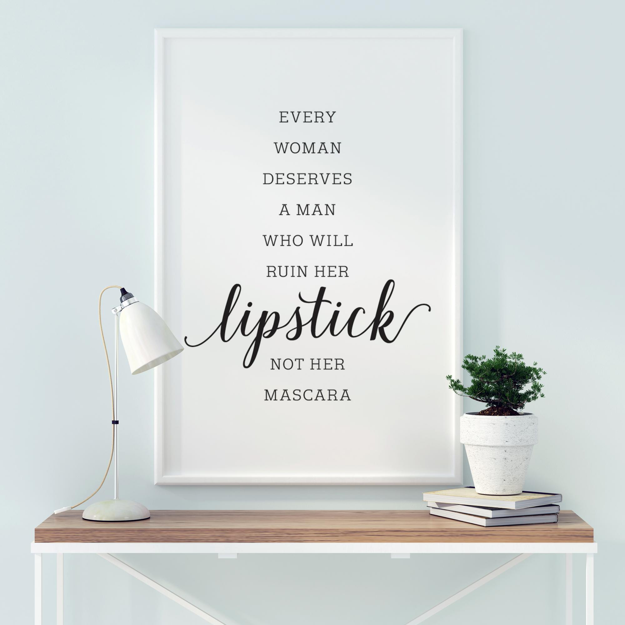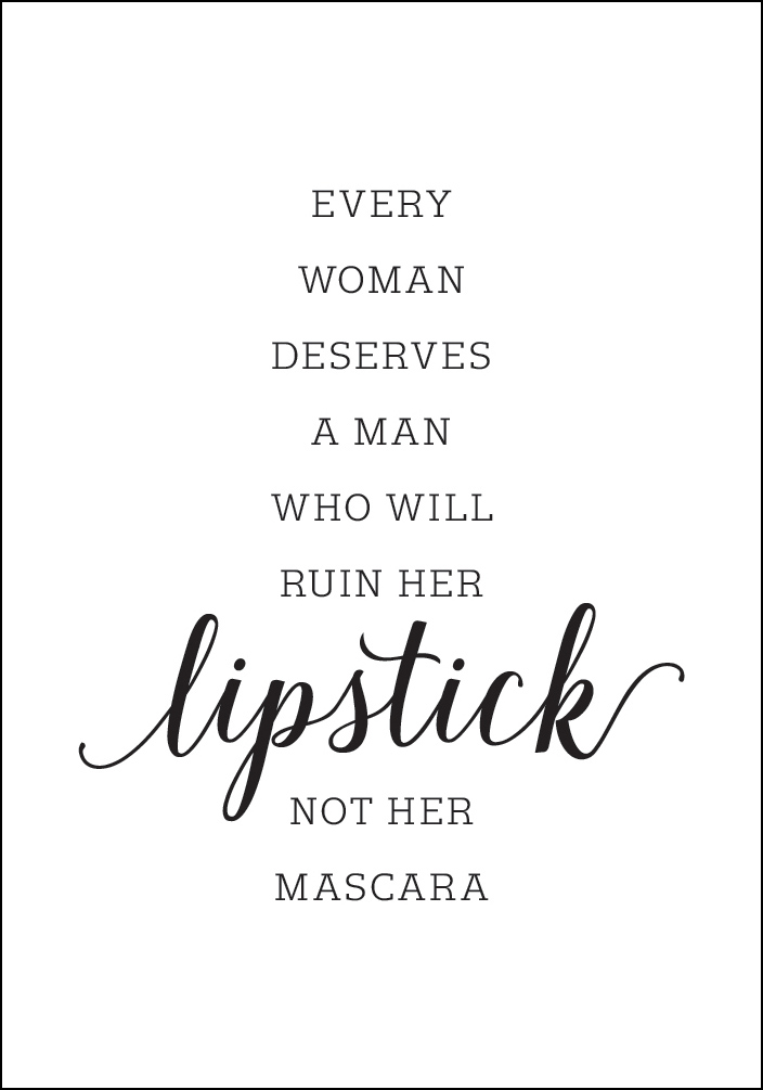A motivational poster with a strong quote to get you going in the morning. Every woman deserves a man who will ruin her lipstick not her mascara are words to live by. Start your day off right with this simple idea on this cute calligraphic inspirational image.