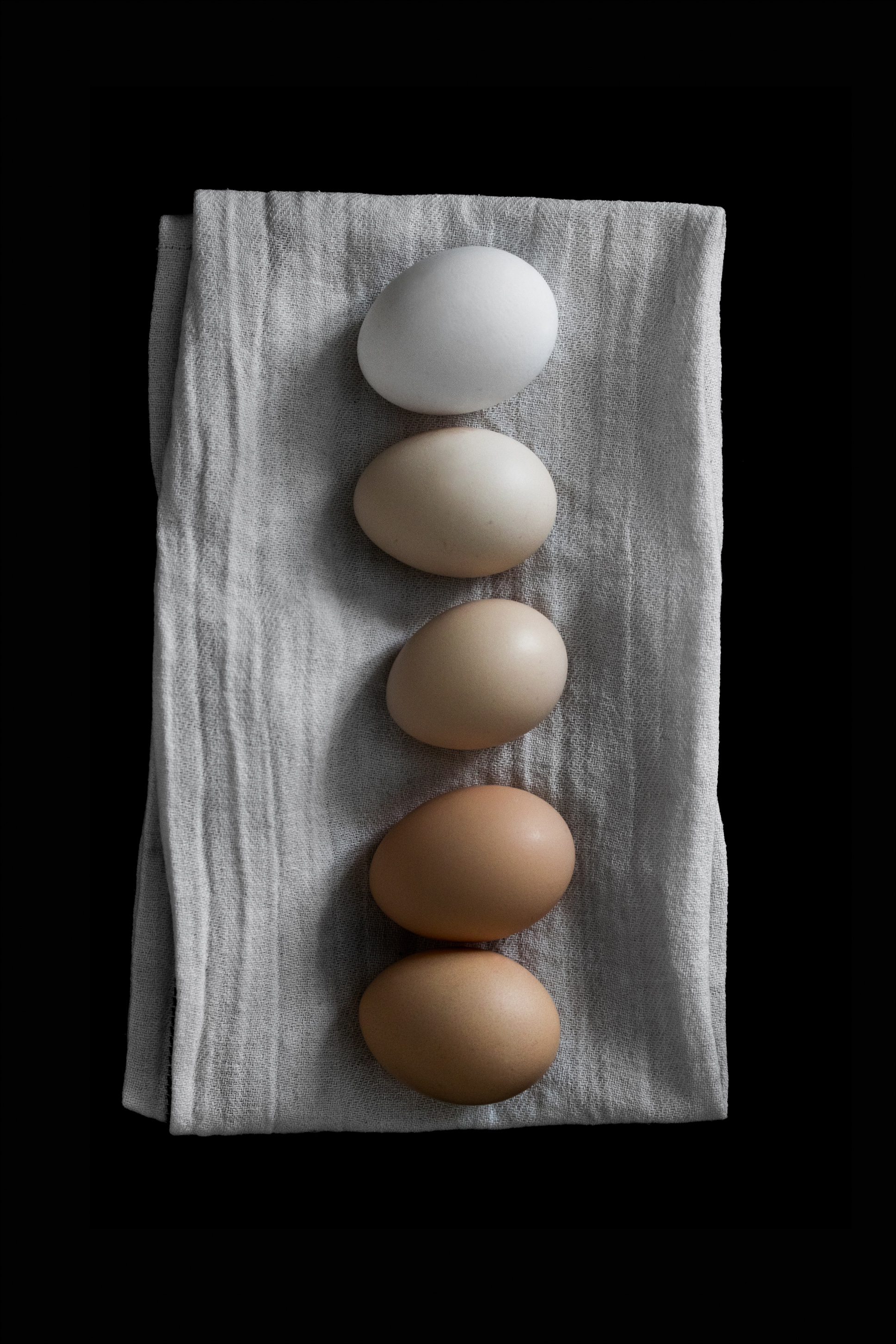 A cute rustic poster of five eggs laid out in a row on a white cloth. Each egg is a different colour starting from white at the top and going through different tones to brown at the bottom. For a fun quirky cookery feel, add this to your kitchen wall.