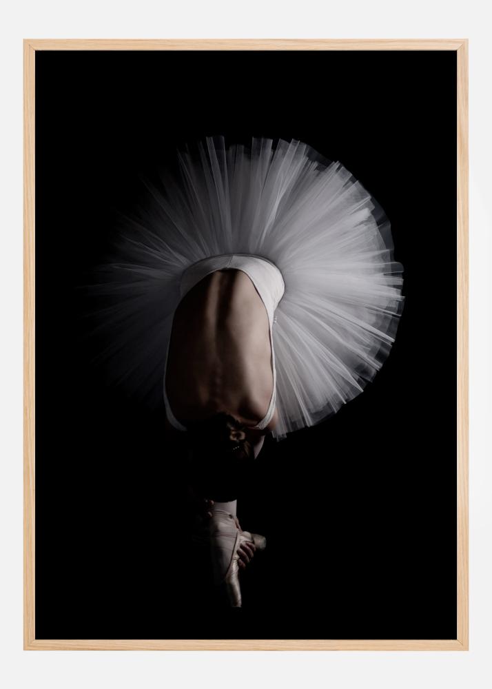 A dramatic aerial poster of a ballet dancer bending forward to reach her shoes. The dark black background makes her white tutu pop in a bright circle around her. The strong lines of her back lead the eye to the elegantly pointed feet. Elegance and drama combine in this single image.