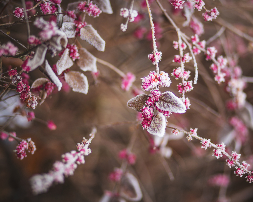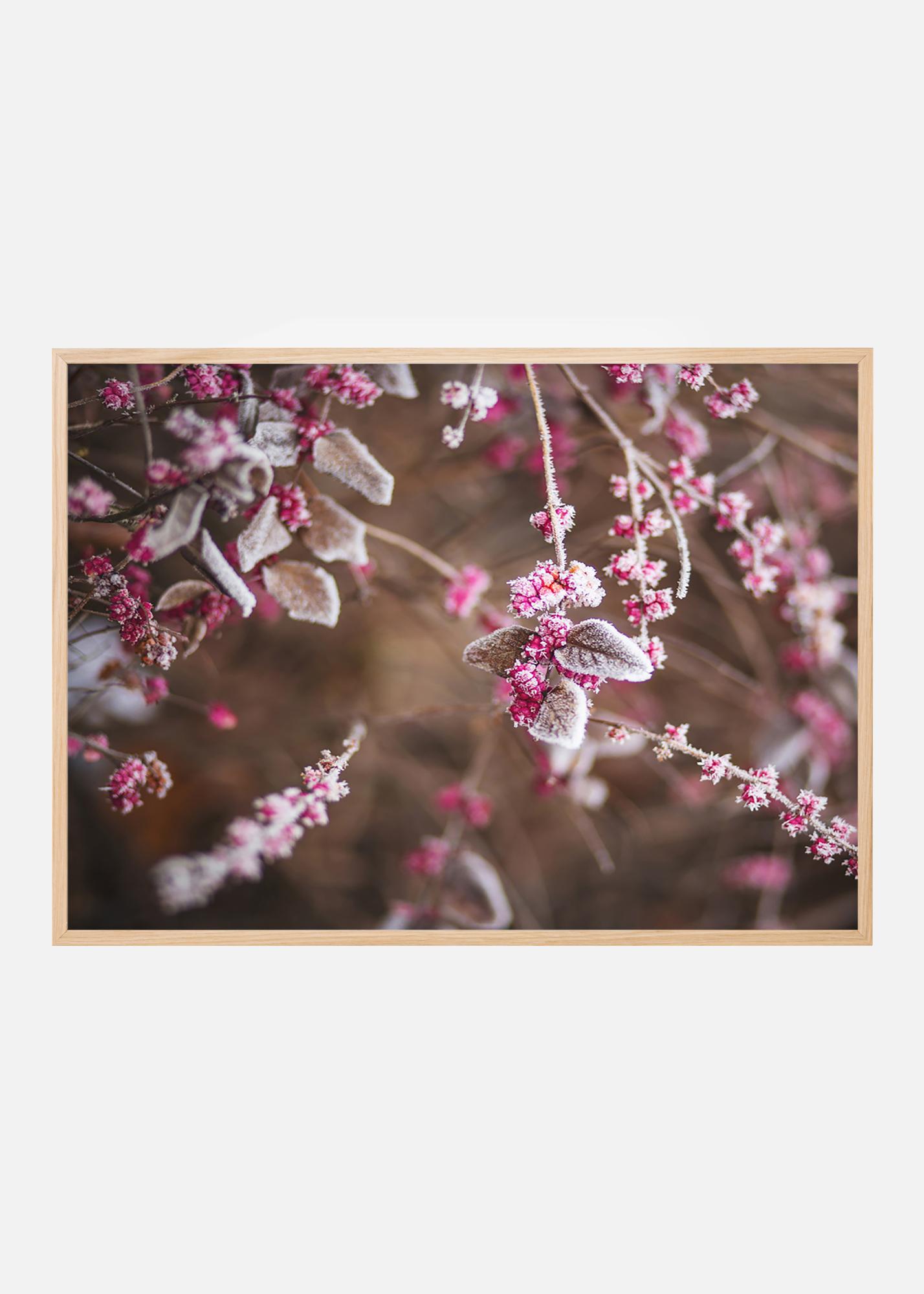 Photo art with a close-up of frost-kissed, dewy berries with a short depth of field. The print, with the berries in pink and the background in chocolate tones, gives a warm and cozy feeling. In a larger size with a stylish frame, the painting becomes a focal point in the living room, or place a smaller version in the picture collage along with other posters in the same colour shades.