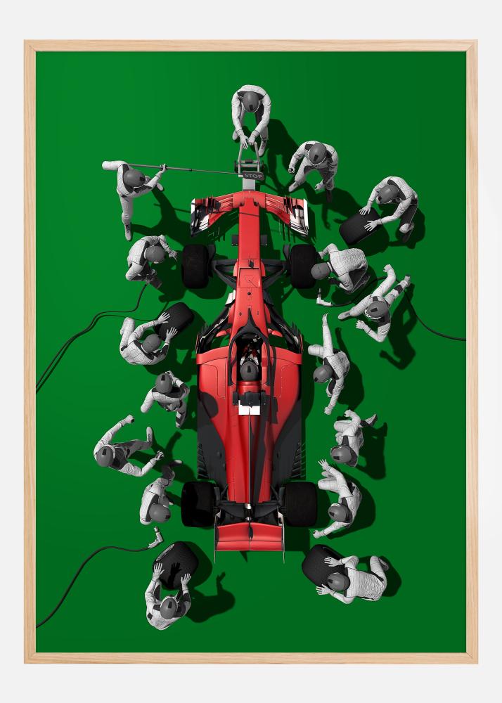 The vivid green background not only sharpens the focus on the detailed gray and white suits of the mechanics but also on the striking red color of the race car. This poster captures the moment of collective concentration and speed that defines every race, making it a perfect addition for anyone who loves the speed and engine roar of race cars. The poster's bold color palette gives it the energy and power to take center stage in any room it is displayed.