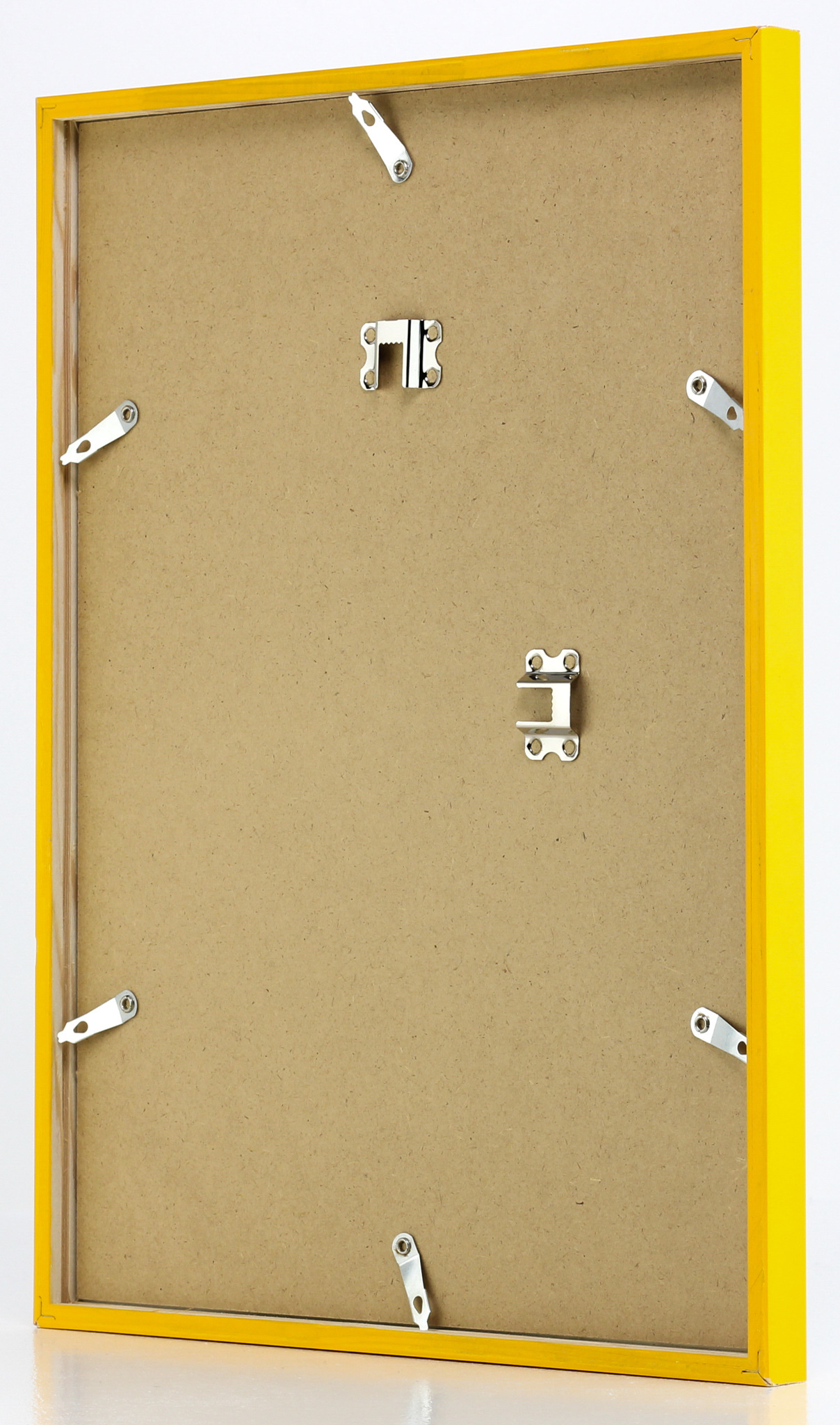 This is a picture frame with a beautiful yellow colour. It is a wooden picture frame made in Sweden with acrylic glass, a type of plastic that is like glass but isn't as fragile. Its edge measures 12 mm wide and 20 mm deep. A colourful picture frame can really help create a lovely, happy atmosphere in your home, and accentuate any picture. Maybe you want to give a bit more life to a black and white poster or give a nice framing to a personal poster with text? In that case, a colourful yellow picture frame is perfect! On the back of this picture frame, you'll find wall fixings allowing you to hang it in both portrait and landscape orientations. The E-Line picture frame comes in several sizes, with this one measuring 70x100 cm.