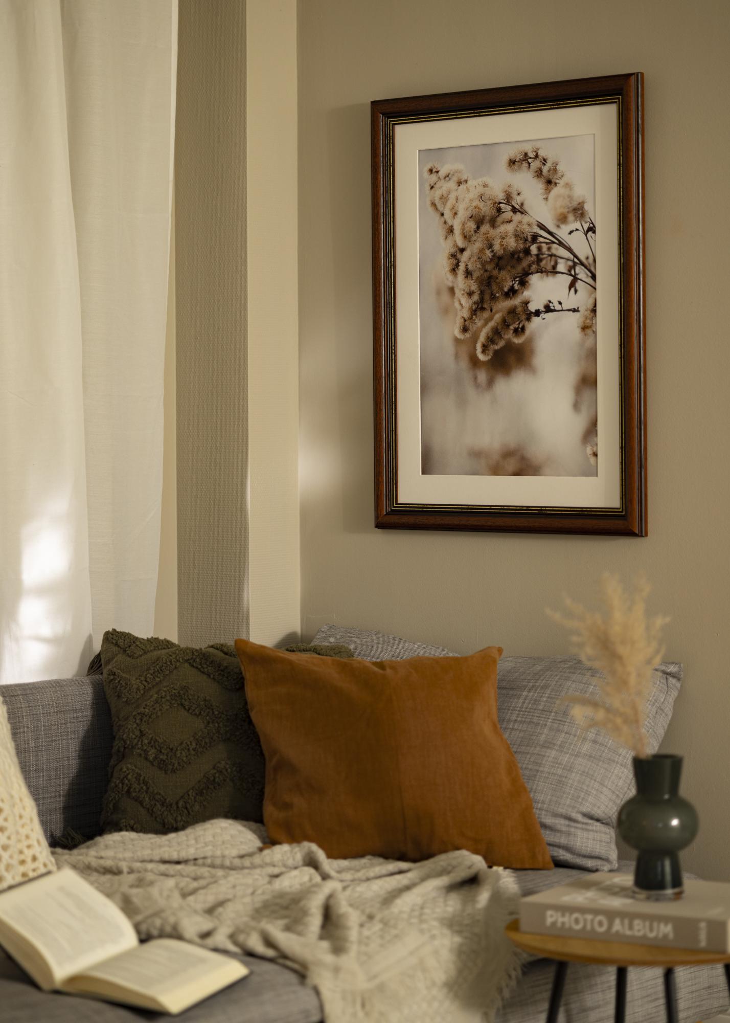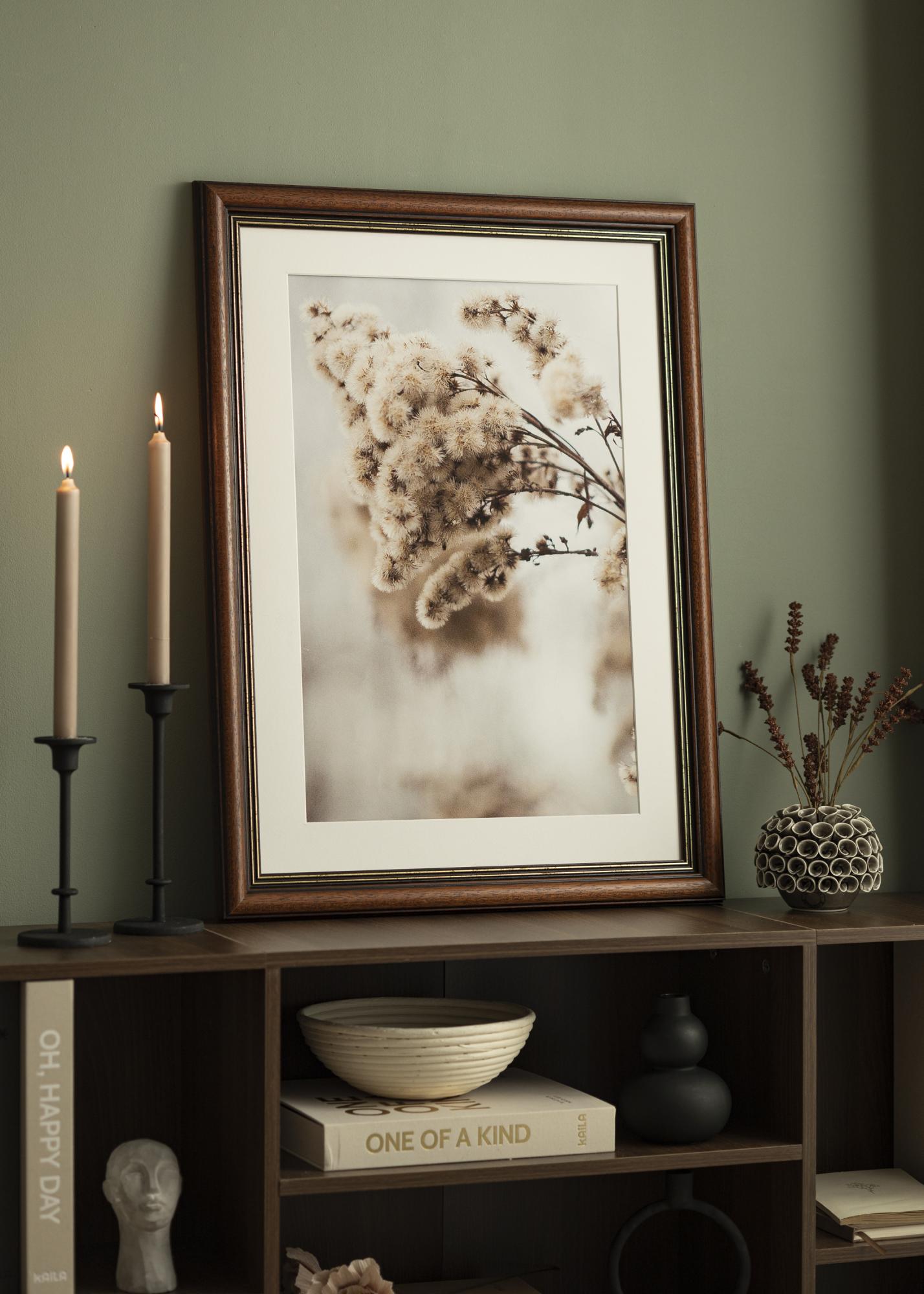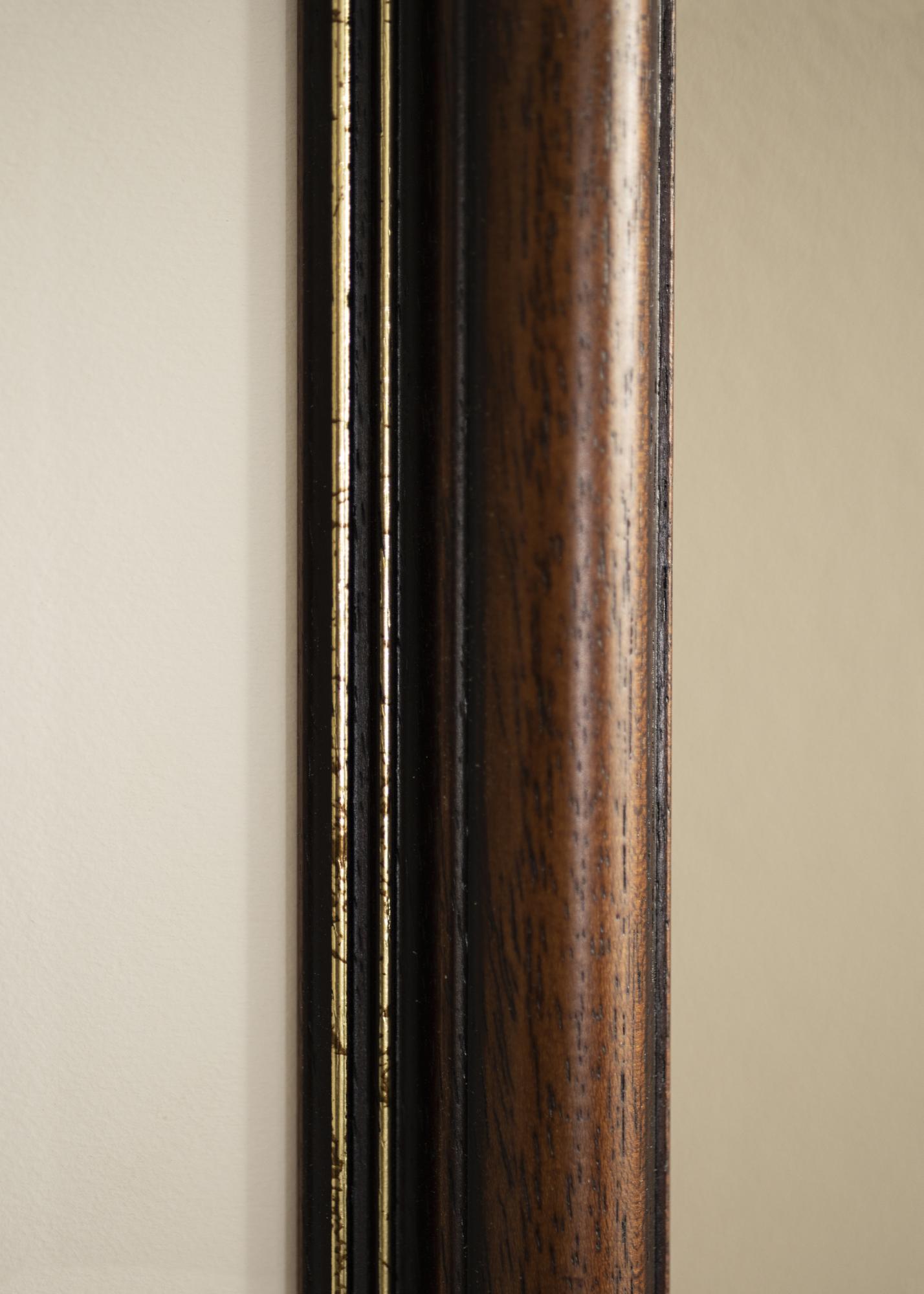 This beautiful wooden frame has a classic design with its beautiful, deep brown hue and traditional edges with black sections. The innermost part of the frame, nearest the picture, also has two golden lines that run all the way around the image, giving it a truly luxurious framing. The frame has even been treated to give it that stylish worn appearance, making it look as though it has its own story.