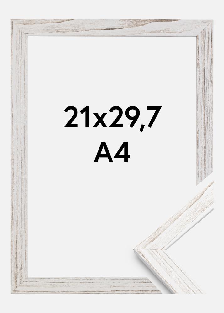 This is a picture frame with vintage design. This white frame has brown veins, giving it a somewhat rustic feel. The frame's edge is 20 mm width and 14 mm deep. This picture frame is made from pine and has real glass. The Vintage White picture frame comes in many different colours that you can match with others. This photo frame measures 21x29.7 cm, and suits A4-sized photos.