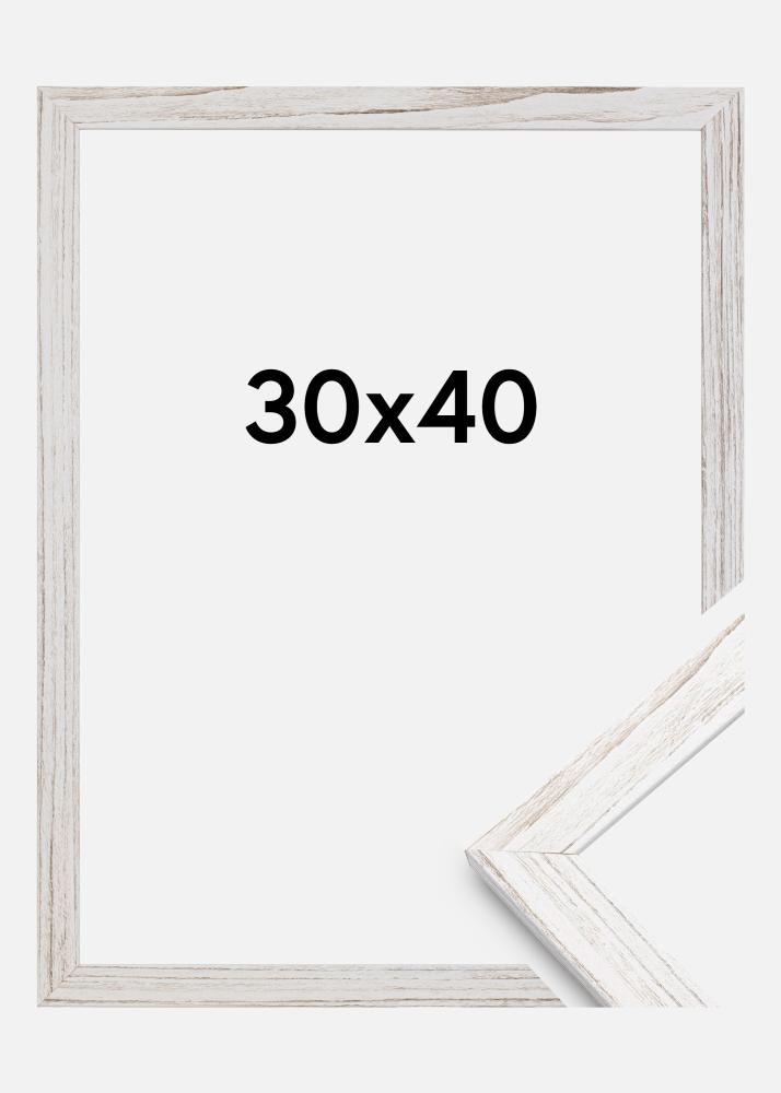 This is a picture frame with vintage design. This white frame has brown veins, giving it a somewhat rustic feel. The frame's edge is 20 mm width and 14 mm deep. This picture frame is made from pine and has real glass. The Vintage White picture frame comes in many different colours that you can match with others. This photo frame measures 30x40 cm.