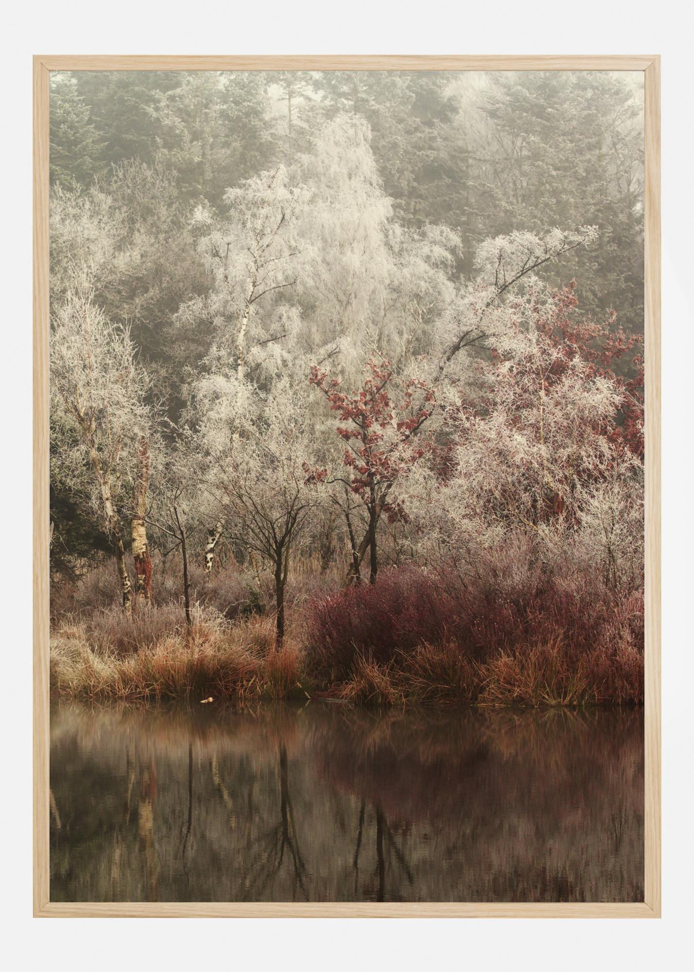 A silent and still poster of a frozen woodland. A clear still lake sits in the foreground with dark red grass and frost-covered trees in the background. You can almost feel the stillness and calm that exudes from this beautiful, magical image.
