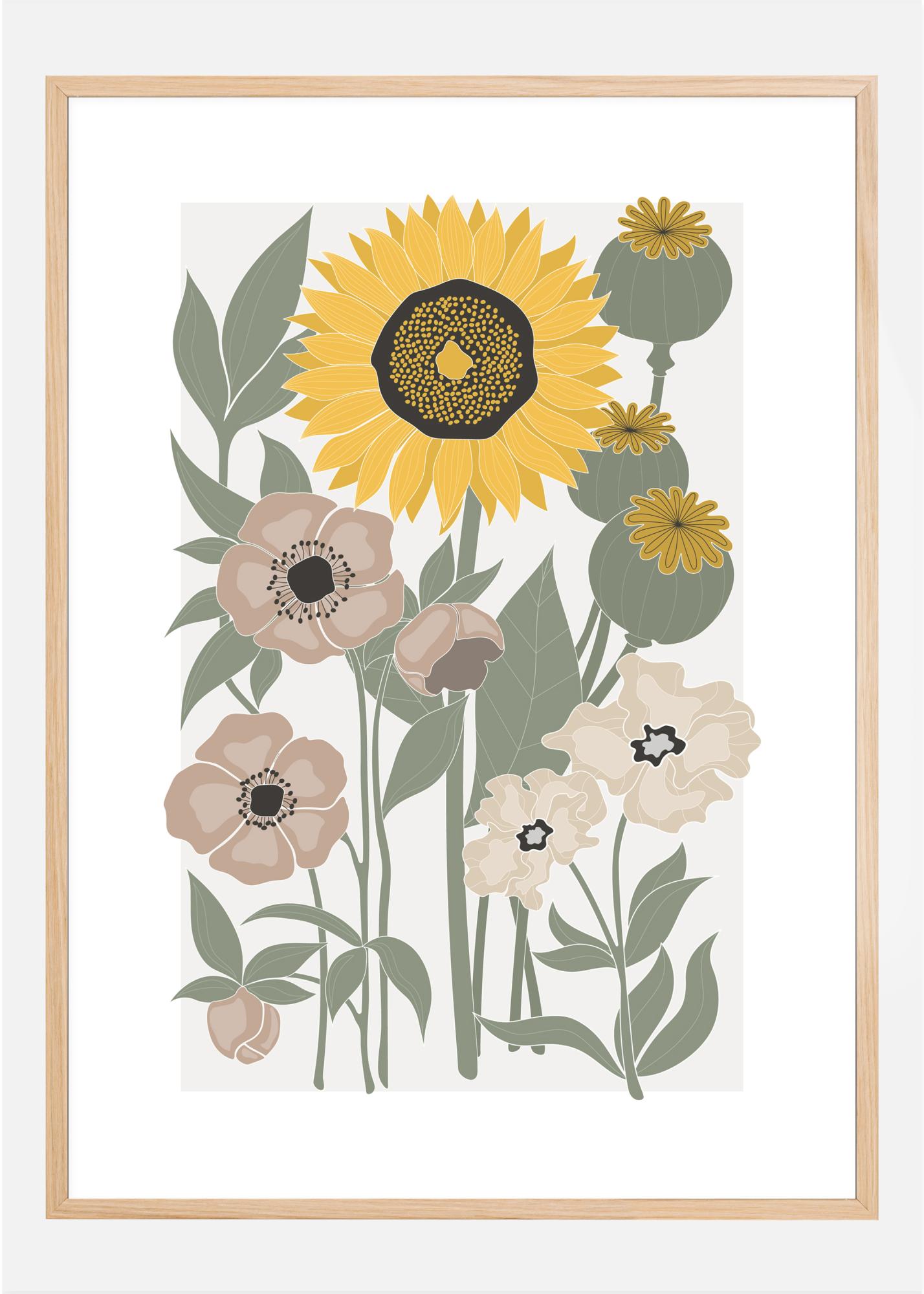 A soft print poster of various flowers. A bright sunflower dominates the centre of this image with other flowers including poppies in this garden poster. The simple print style makes it easy to see the details and enjoy this sunny picture.