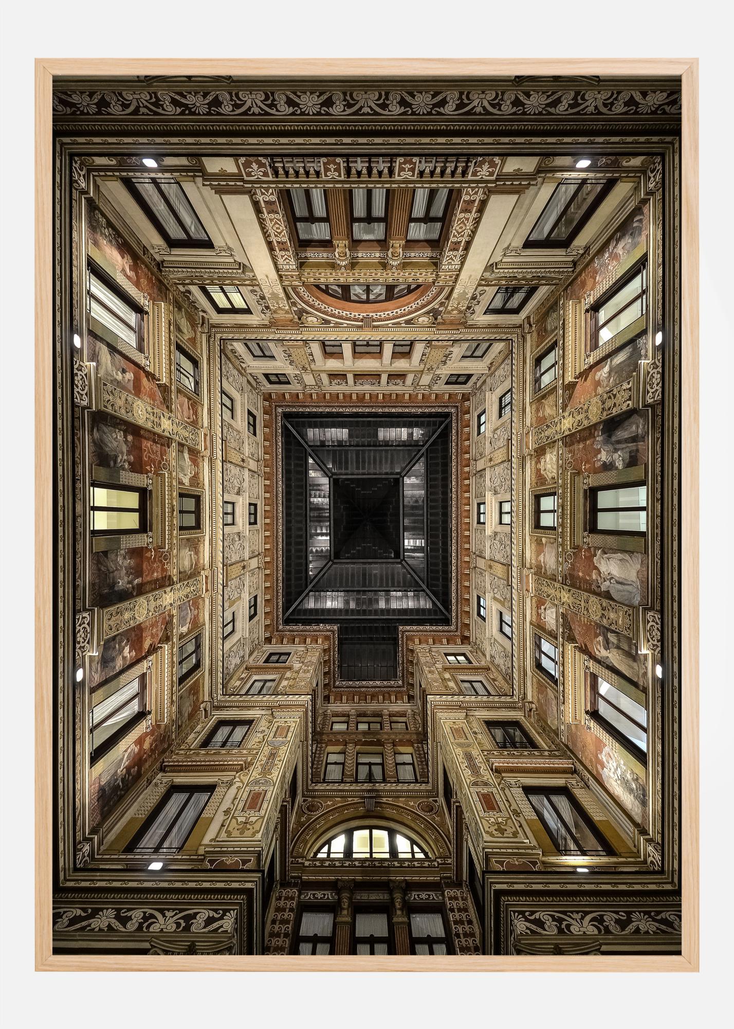 An interior poster of the Galleria Sciarra and its stunning architecture. Imagine you're in the building itself as you look up at the ceiling and see the stunning array of windows and intricate designs. Bring a piece of travel with you into your home.