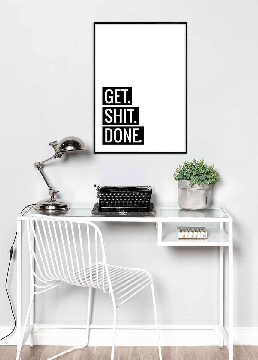 Decorate your walls with straightforward and bold calls to action! This stylish poster is in white and features a black and white print with the text "GET. SHIT. DONE". It shouldn't be more complicated than that! The minimalist design can be ideally combined with your favourite colours for the frame, mat, and various interior components. Place it on your desk or hang it above the sofa! Since the poster is available in 6 different formats, it can fit wherever you want it.