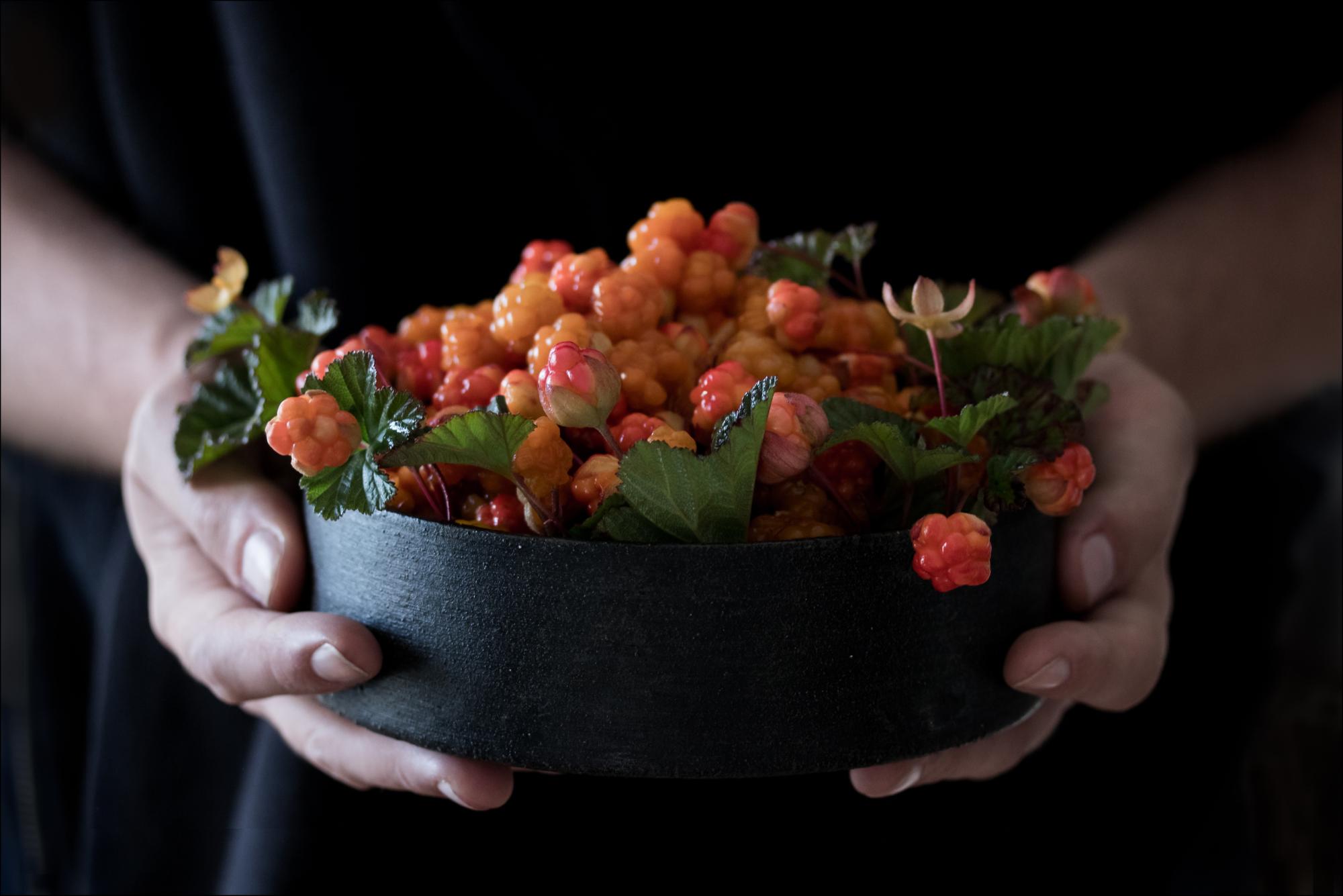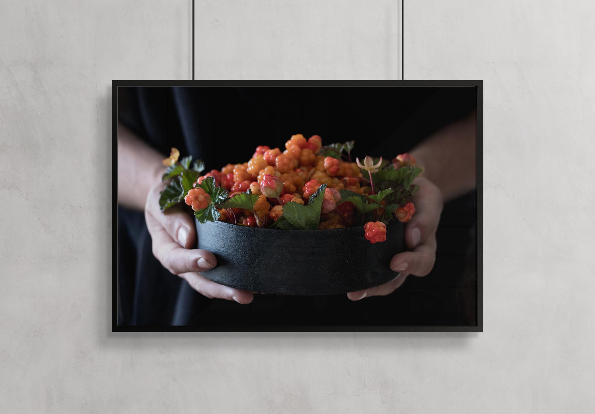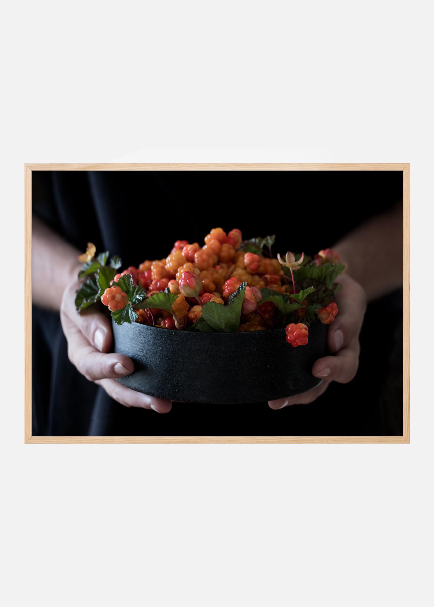 A fruit poster of golden berries held in a pot by two hands. This crisp photograph has the golden globular berries and leaves in a simple black bowl. Two hands clasp it, holding it out as if they are about to hand it to your right there and then.