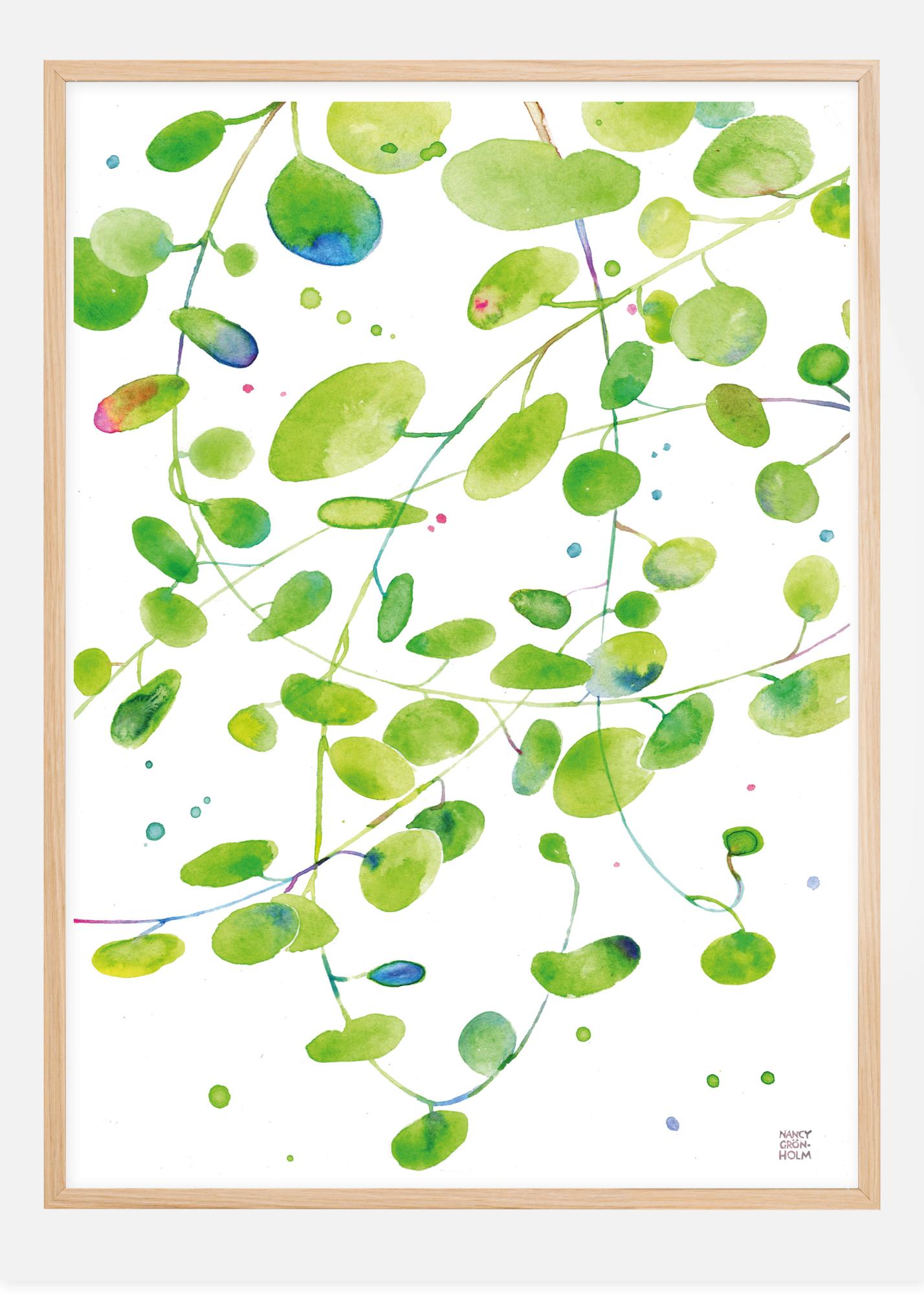 A delightful abstract painting depicting small green leaves. The green print leaves stand out against the white background as they blow gently in the breeze. Add this abstract print to a natural coloured wall for a soothing and calming look in your home.