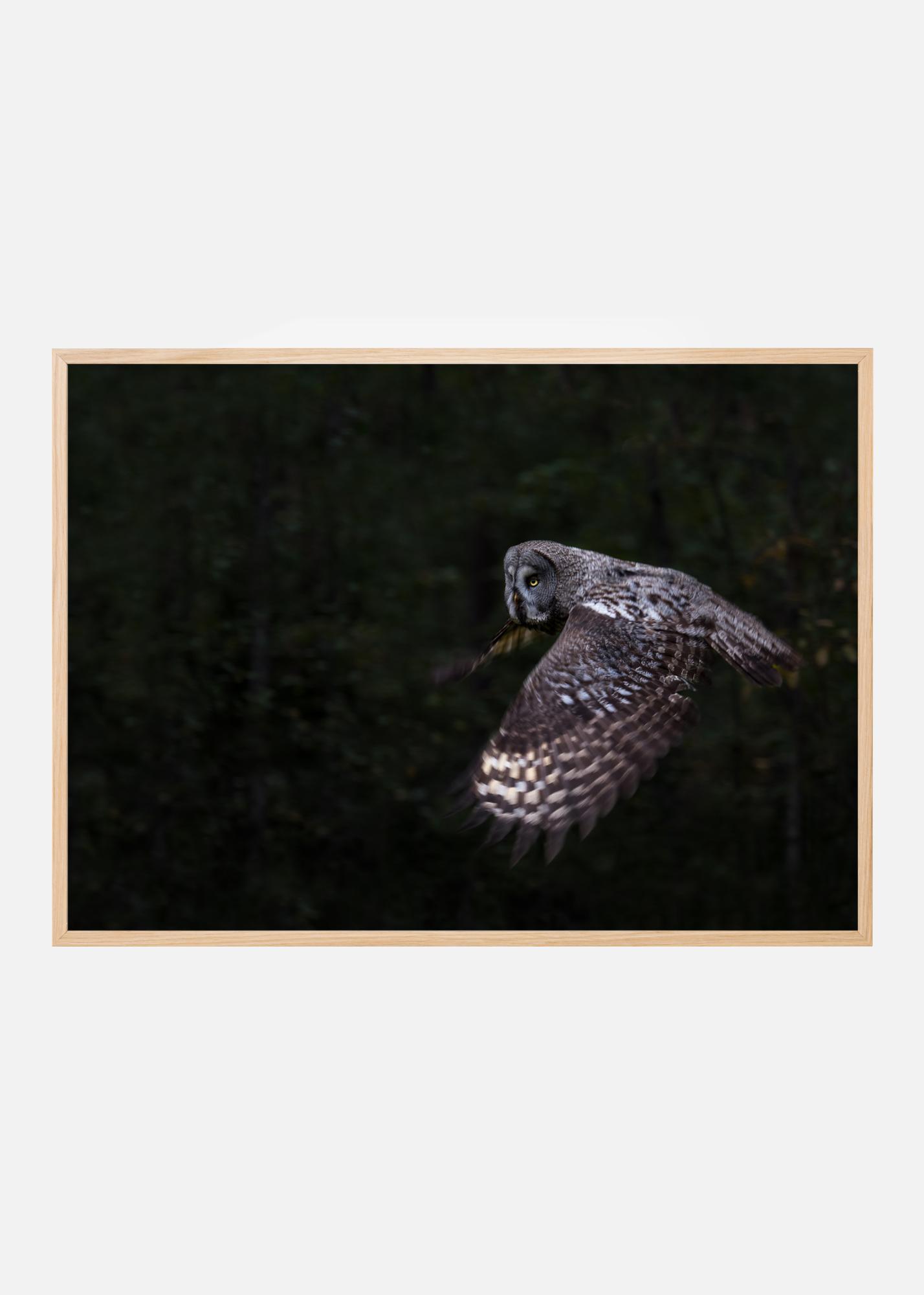 A regal poster of a majestic owl flying buoyantly and effortlessly in the woods. With his wings spread widely you can almost hear the silence. Staring into the distance, his large round yellow eyes are carefully observing the prey below. Feel the power in this pose when you hang this print in your home.
