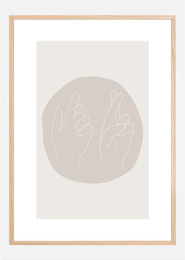 A simple print of two left hands on a circular beige shape. The circle has be mounted on a nude colour background with both hands pointing towards the top of the print. The hands are relaxed, creating a tranquil ambiance for your home. The perfect print for your work study.