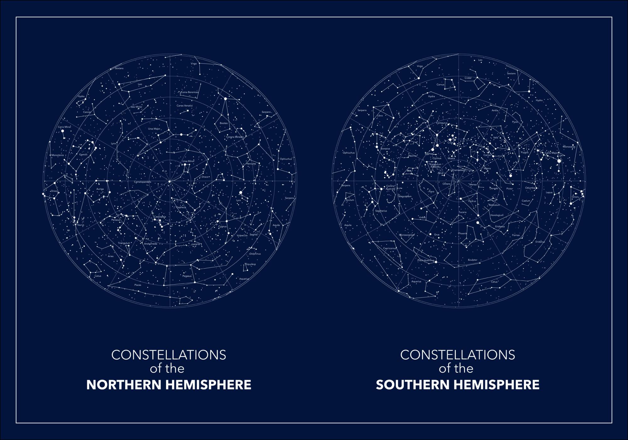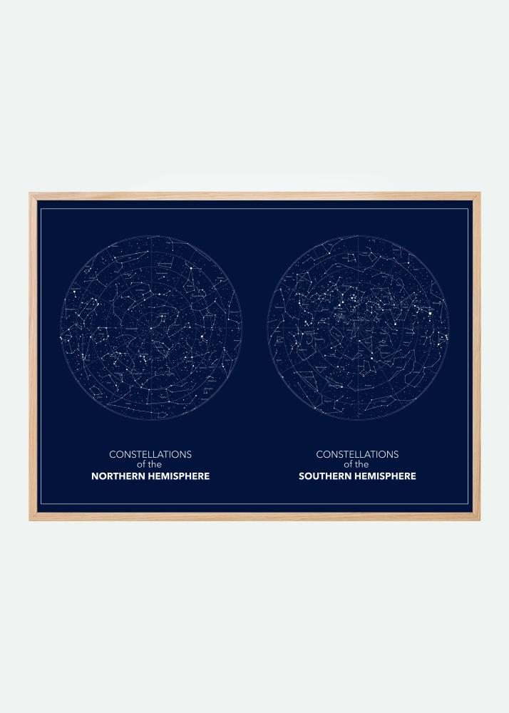 A fascinating dark blue print of the Northern and Southern hemispheres. Both images are placed next to each other. Set on a dark blue background, the constellations are faintly outlined in white. Hang this print in your study to create a sense of immensity.