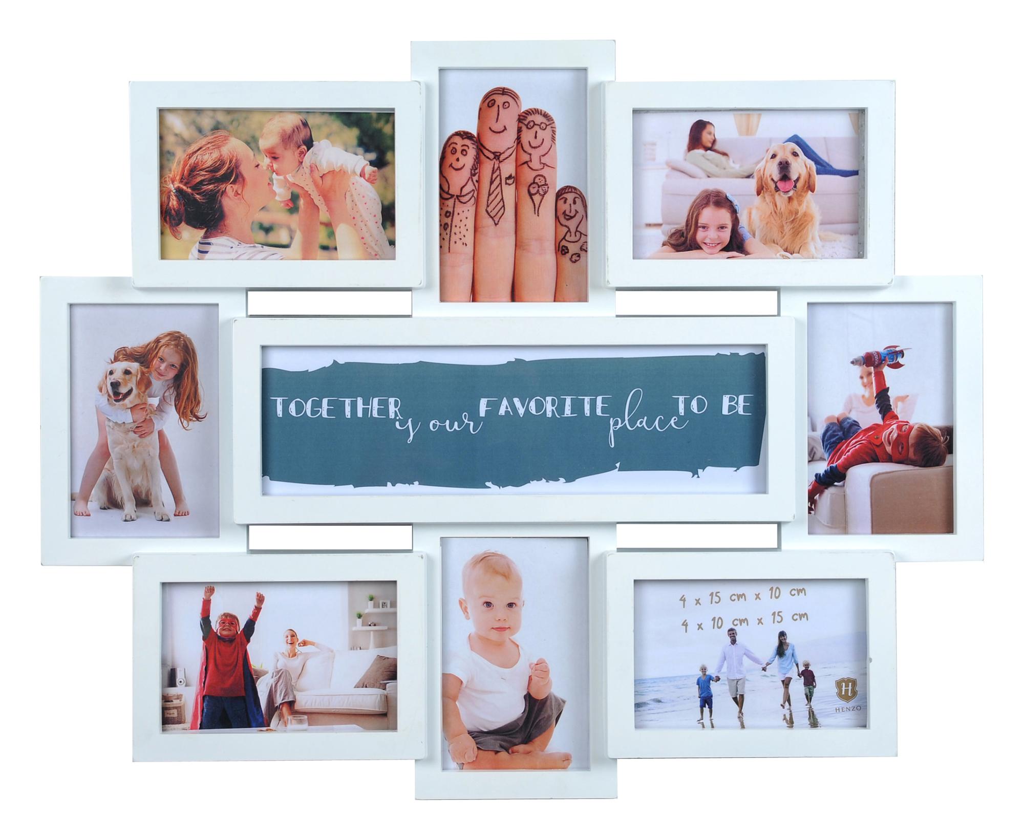 Gather your nicest photos in an attractive collage picture frame! This picture frame isn't just pleasing to the eye - you can also completely redesign it! That is to say, included with the frame are five charming texts that you can put in the middle-most (9th) picture frame, and change them around whenever you feel like it. For example, you could have the text say "All you need is love" or "Say yes to family". This collage picture frame comes in black or white.